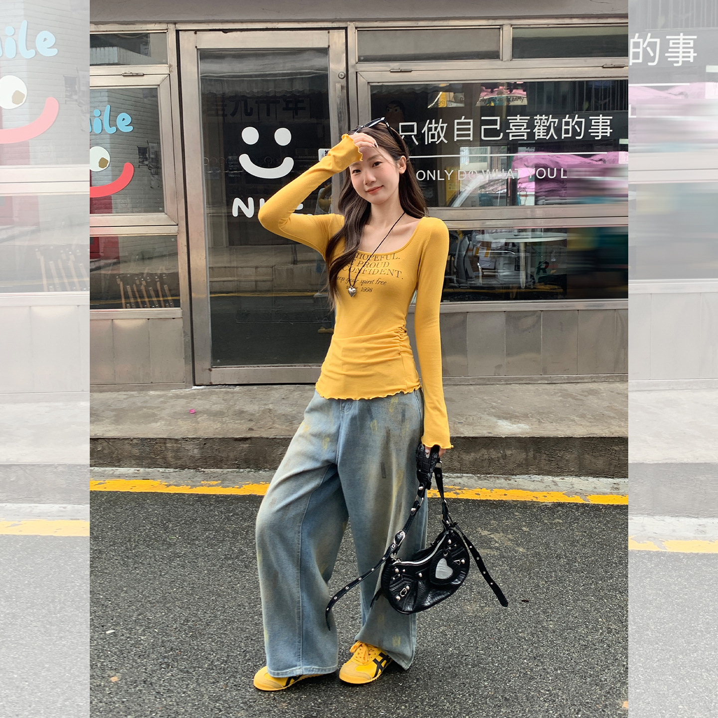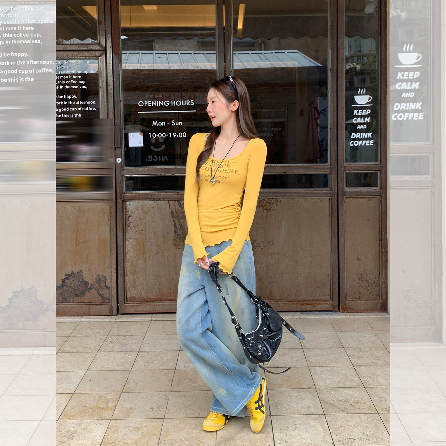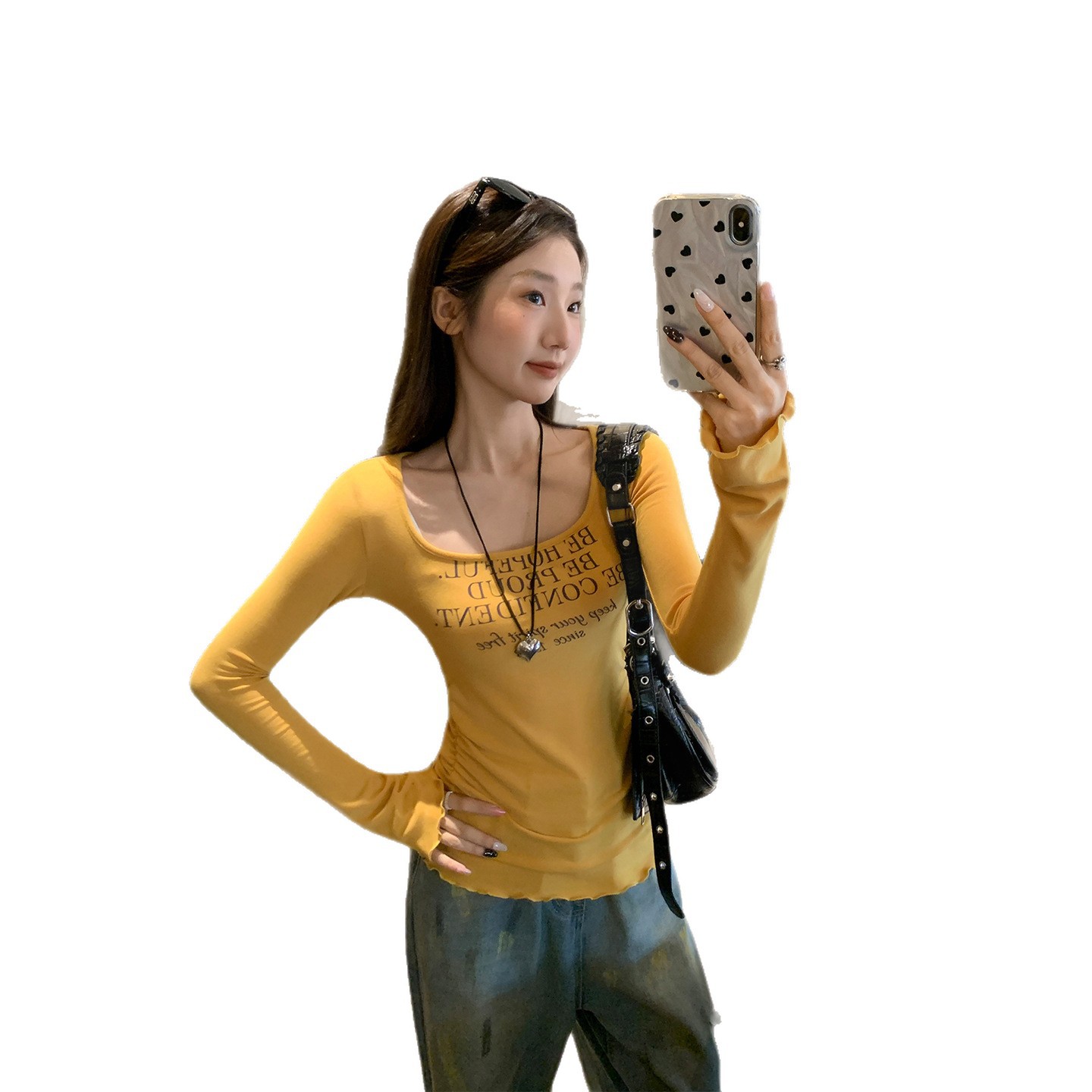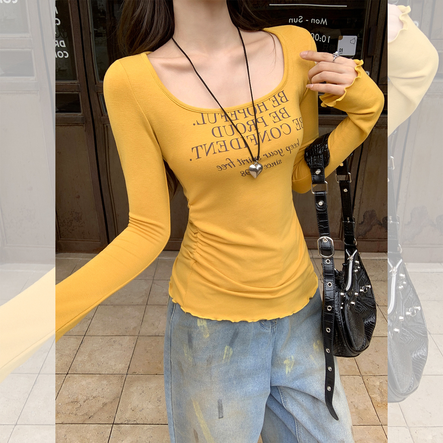U领字母印花长袖T恤女2025秋季修身显瘦木耳边打底小上衣