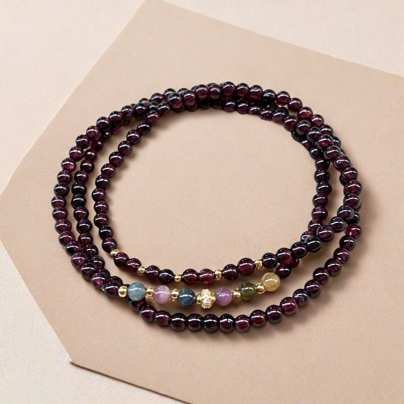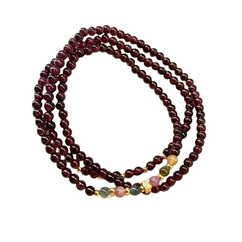 925纯银新款3mm纯天然酒红色石榴石手串女三圈叠戴碧玺女人石手链