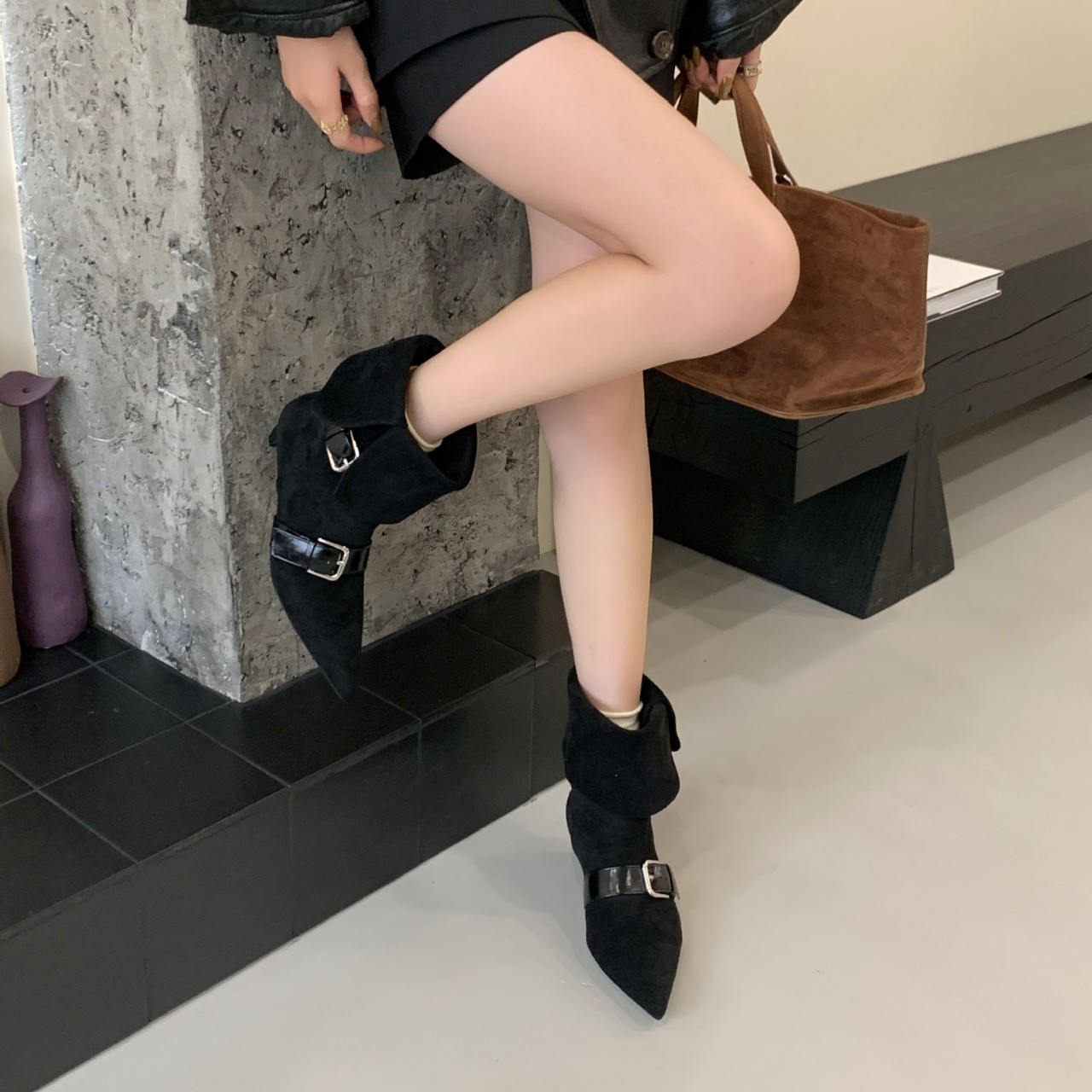 绒面复古尖头两穿翻折粗跟皮带扣中筒女靴2025秋冬新款时装靴短靴