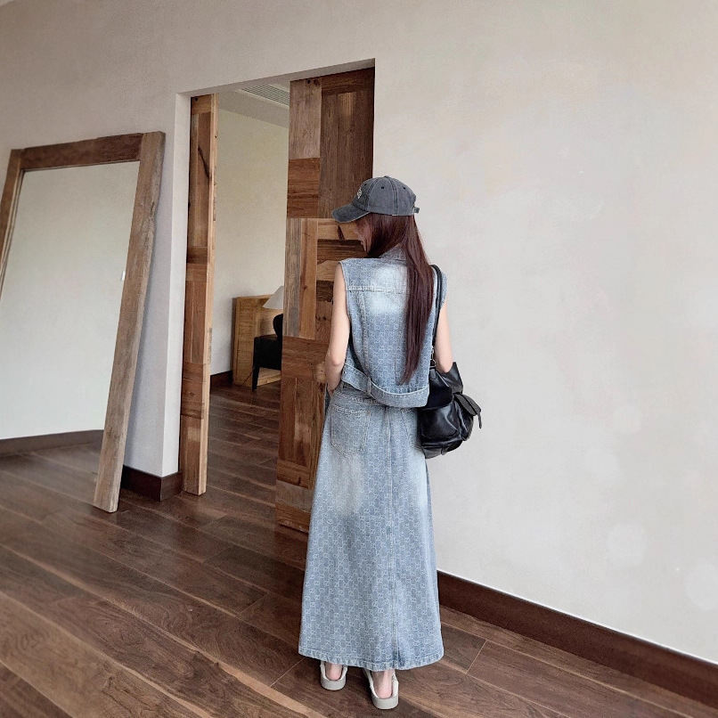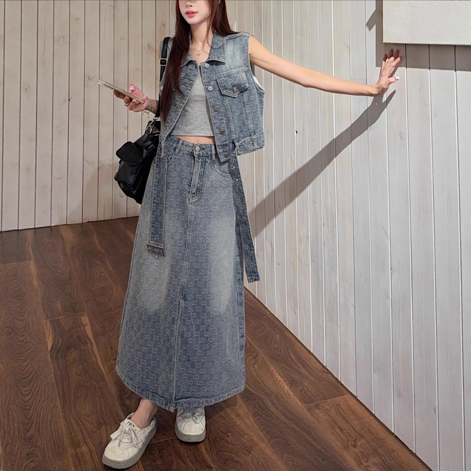 复古无袖坎肩港风复古牛仔套装裙女短款马甲上衣新款半身裙两件套