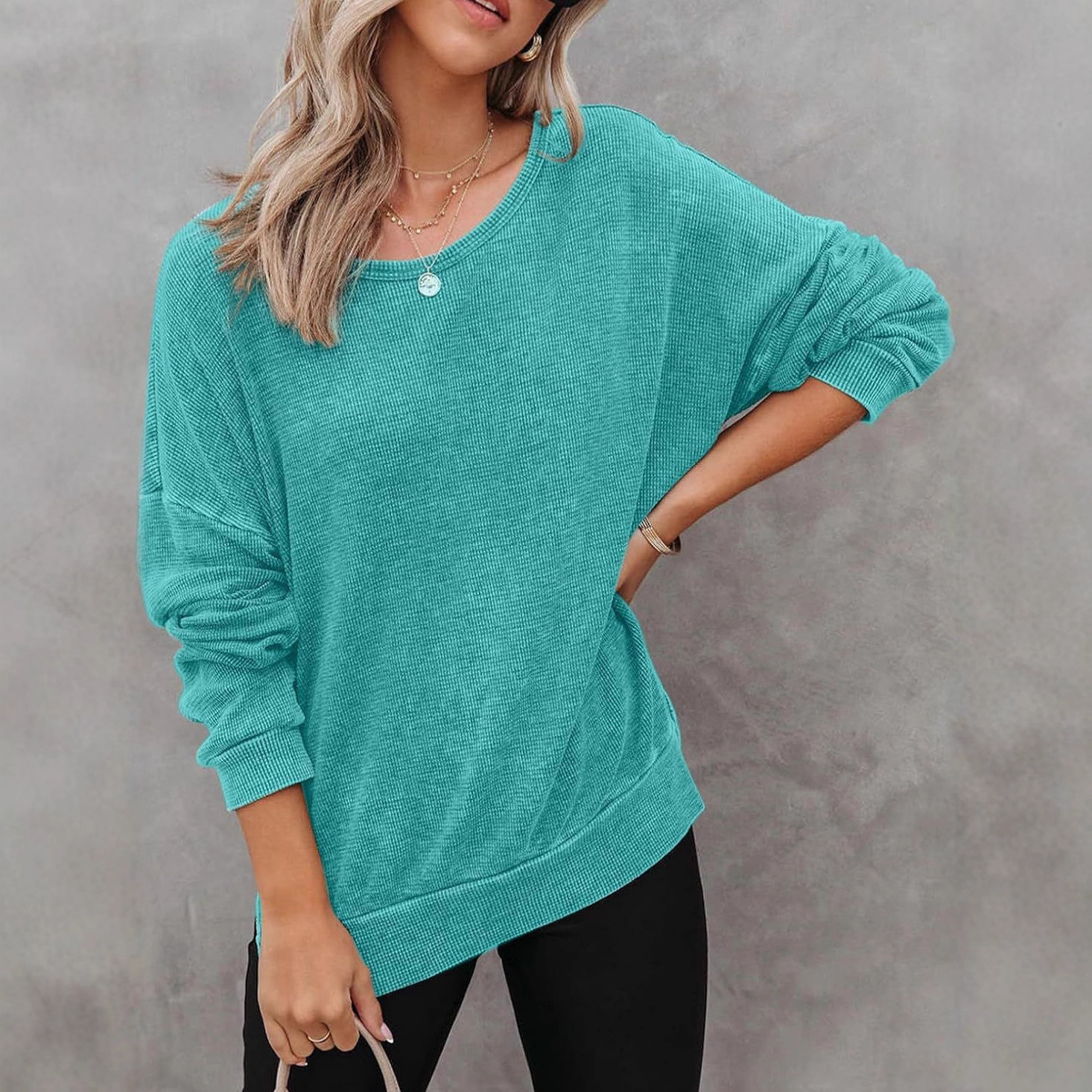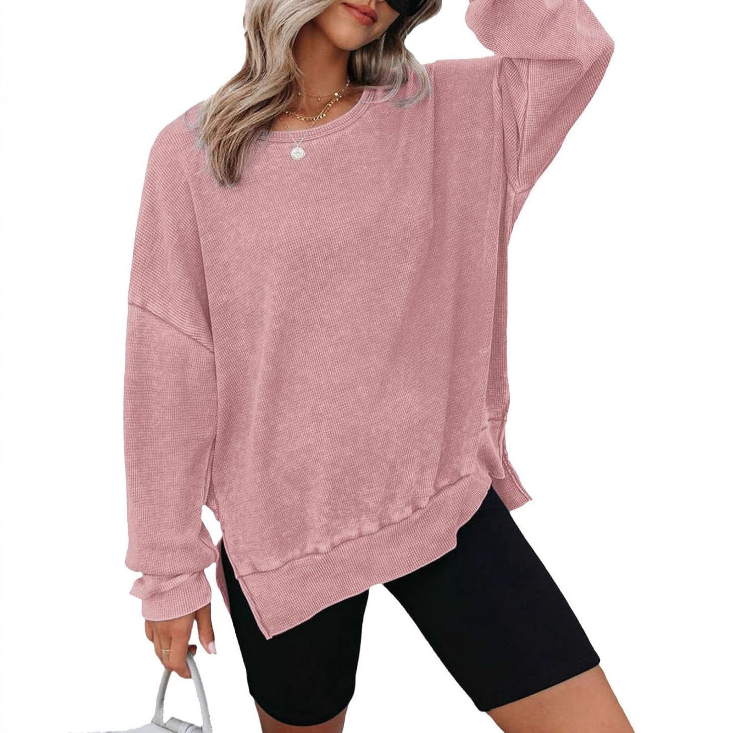2025欧美跨境女装 亚马逊秋季新款圆领长袖侧开叉华夫格卫衣T恤女