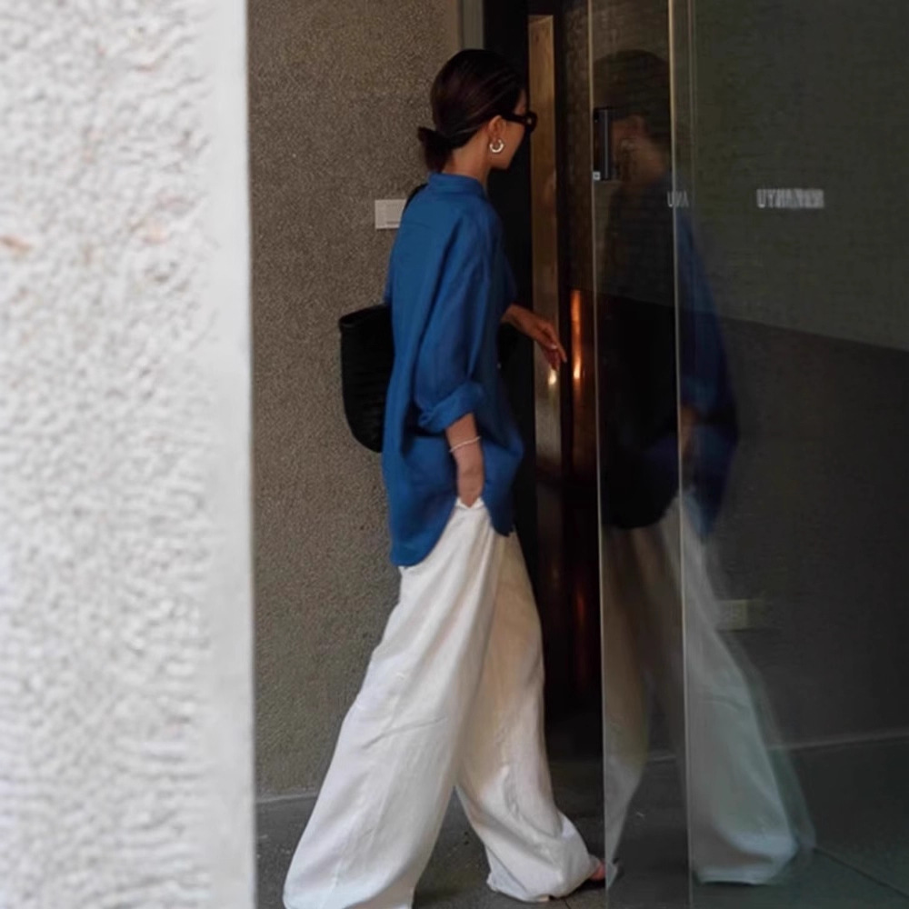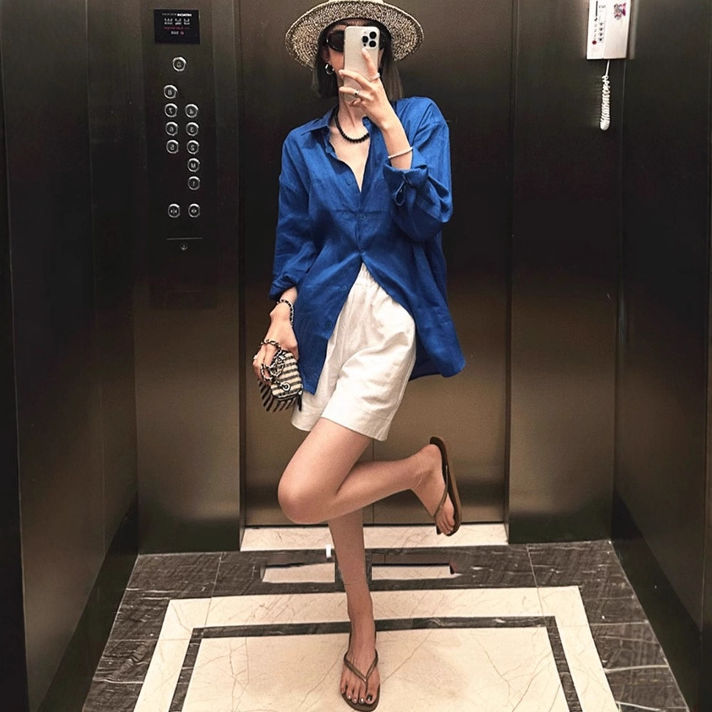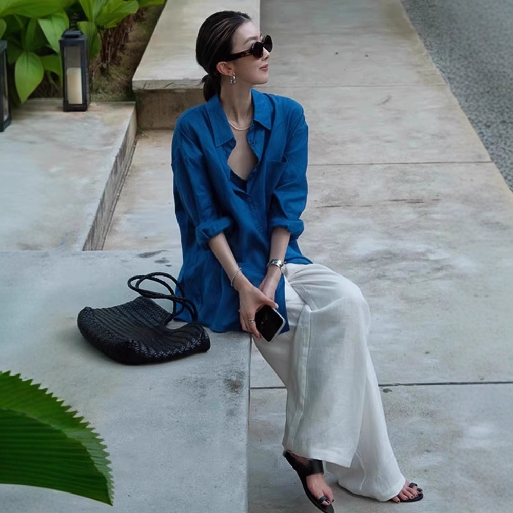 感亚麻防晒长袖衬衫松弛感百搭开衫外套薄款宽松棉麻蓝色衬衣