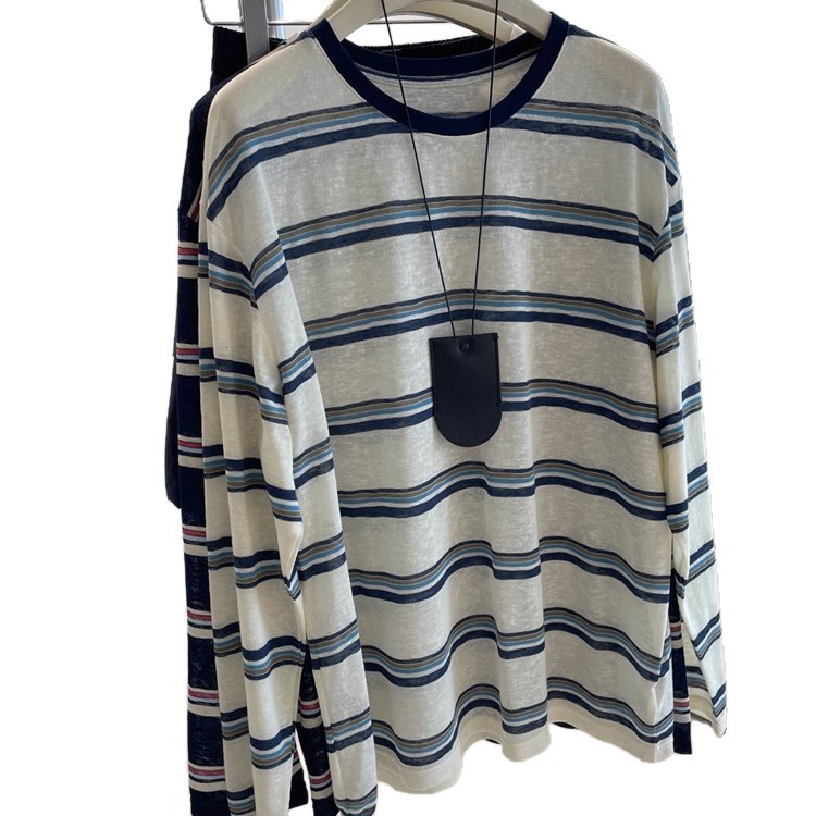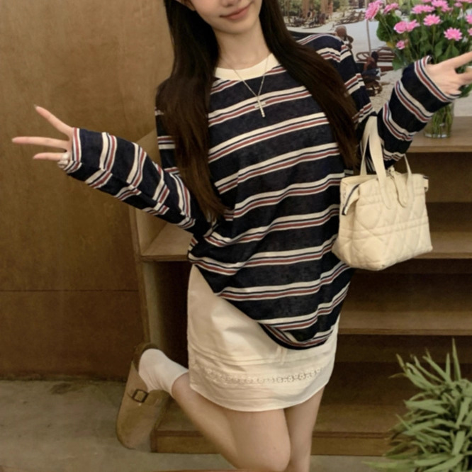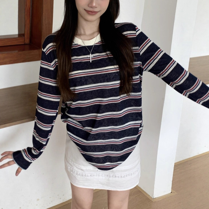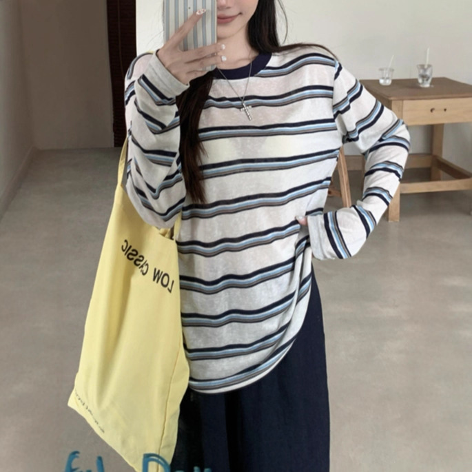 新款韩版复古显白条纹防晒衫垂感宽松显瘦休闲秋季撞色条纹圆领长