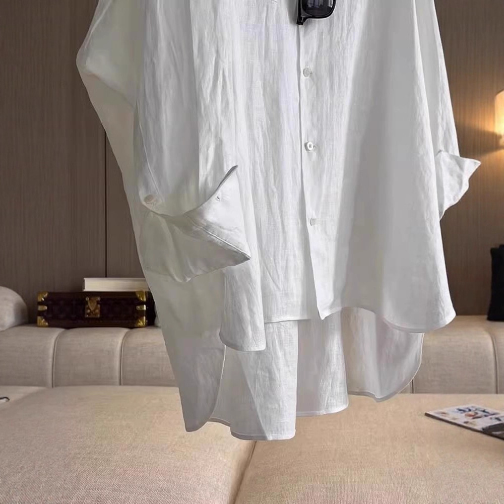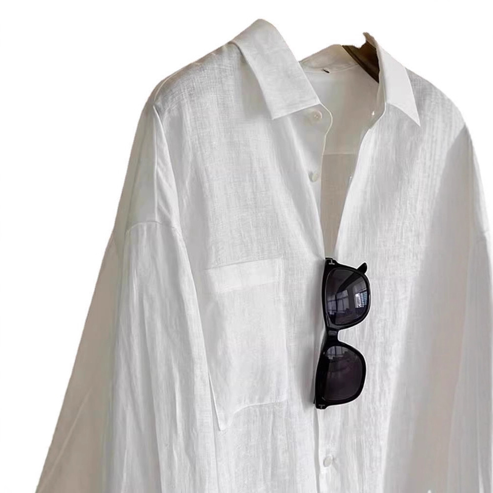 白色棉麻长袖衬衫女夏季法式宽松外搭防晒衬衣设计感小众亚麻上衣