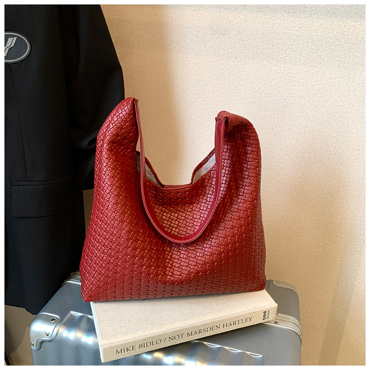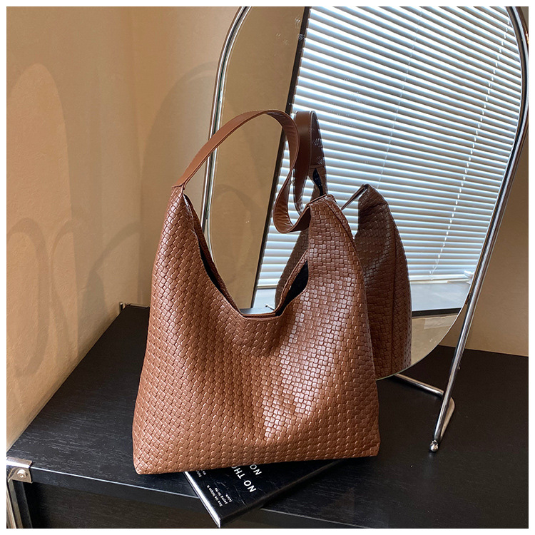 2025跨境女包大容量纯色单肩包流行百搭外贸批发编织纹腋下水桶包