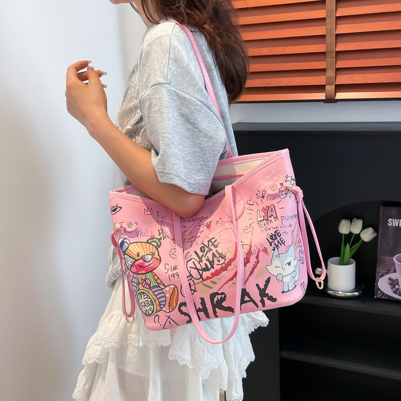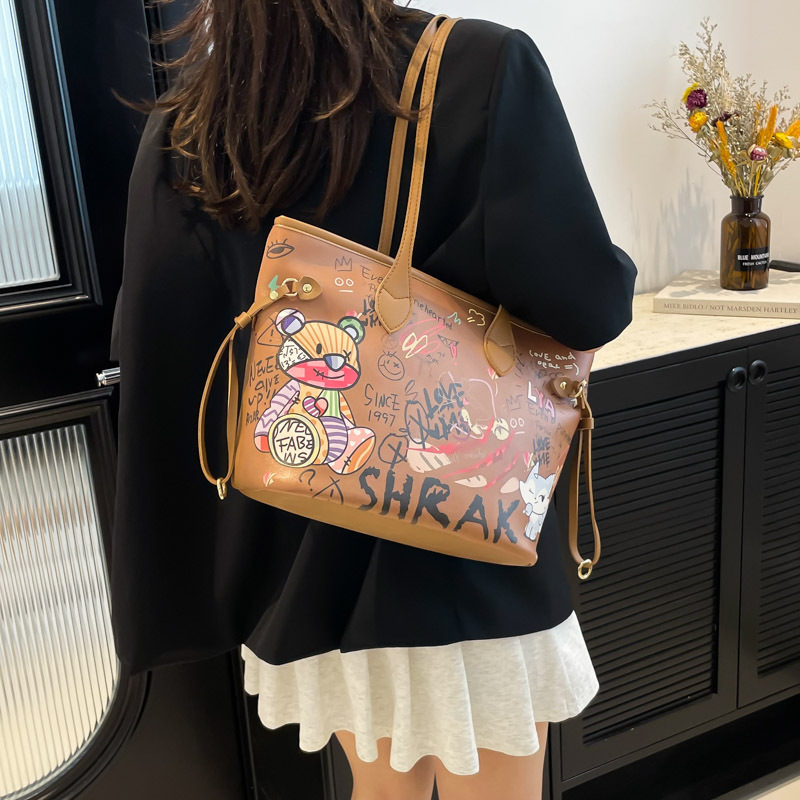 2025新款ins卡通熊仔个性彩色涂鸦手提包休闲时尚托特包女包