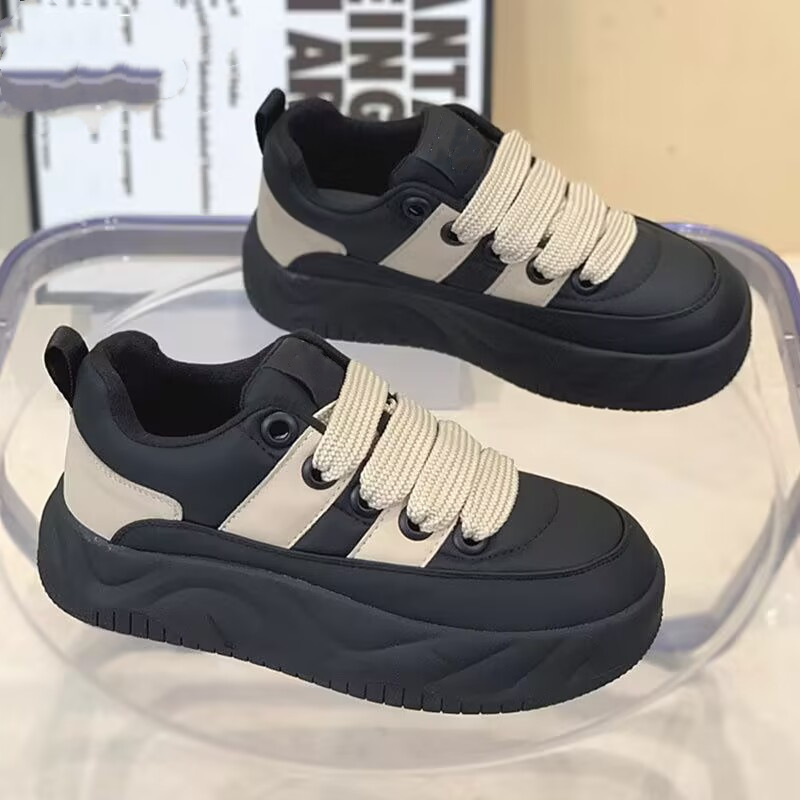 跨境厚底增高休闲板鞋女款2025年冬季新款百搭加绒加厚系带圆头二