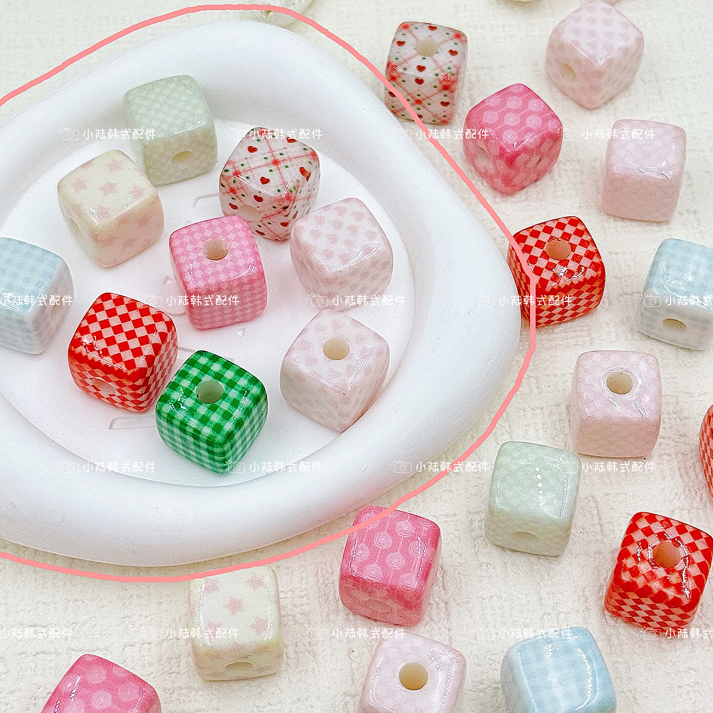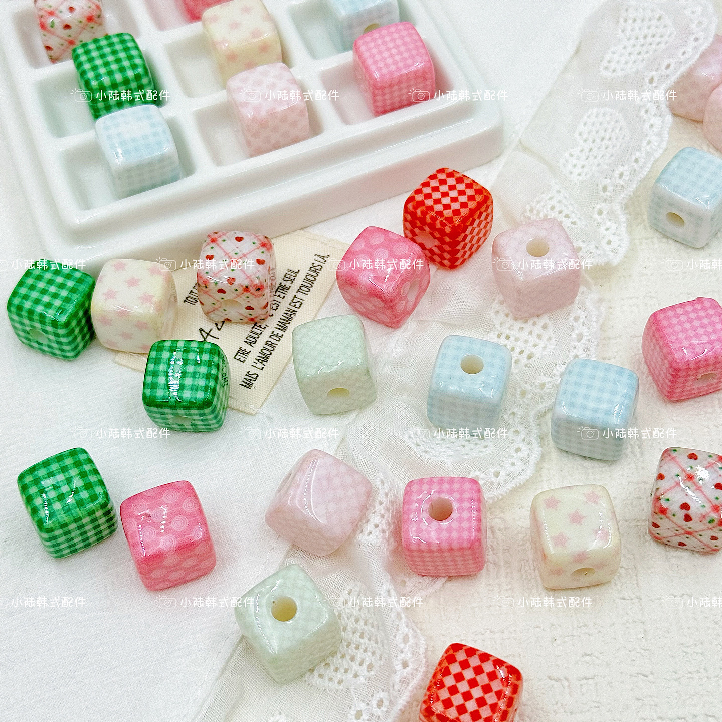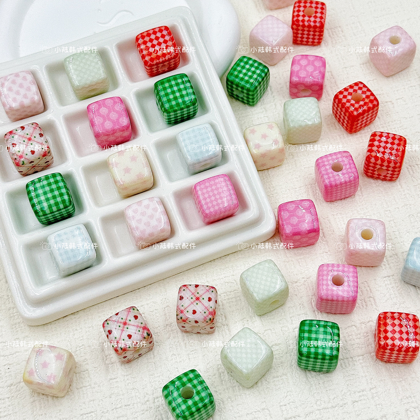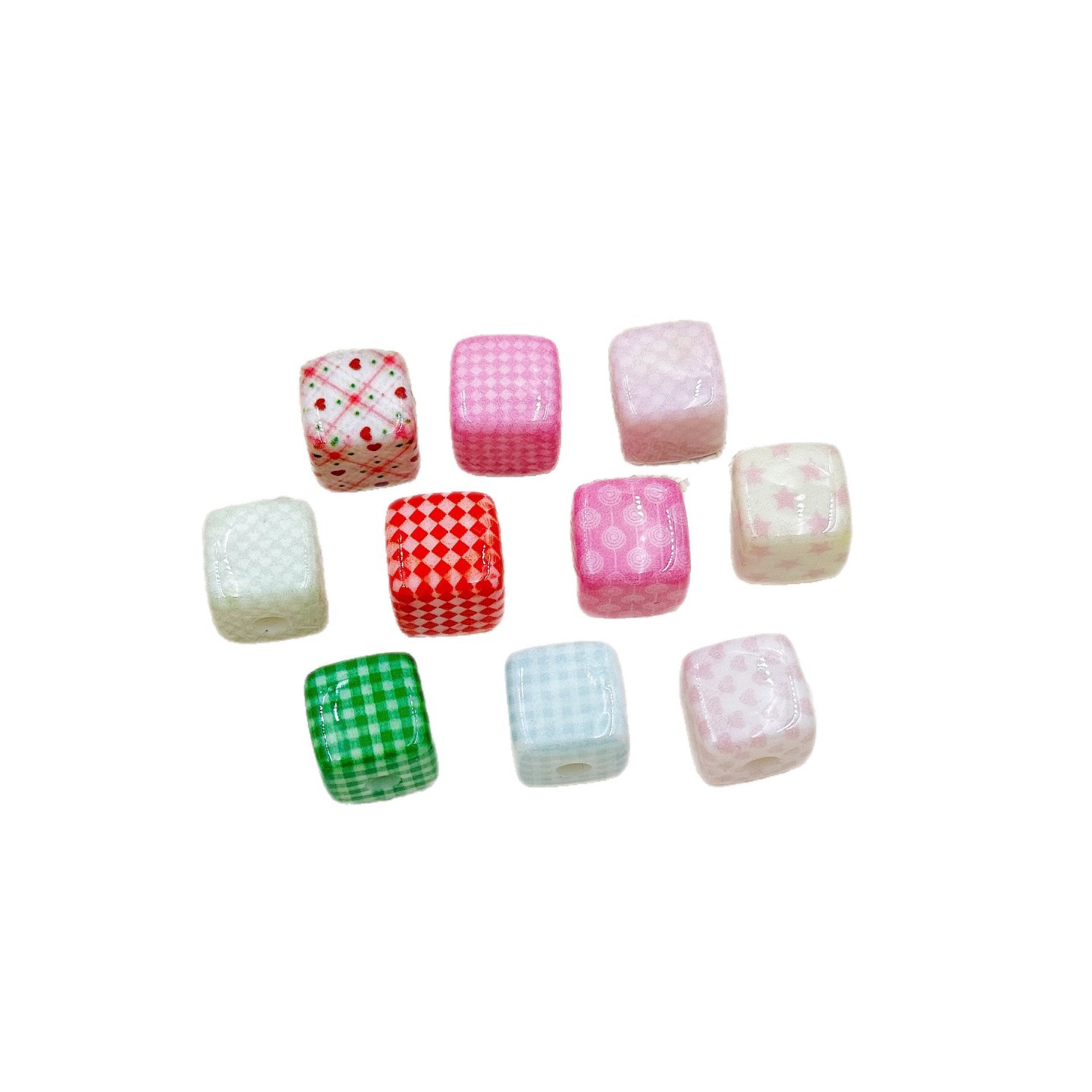 彩色亚克力印刷格子立方体珠子手工diy串珠散珠手机链项链发饰品