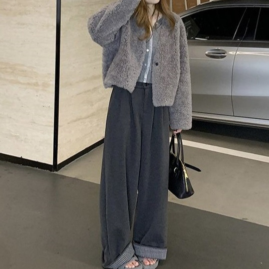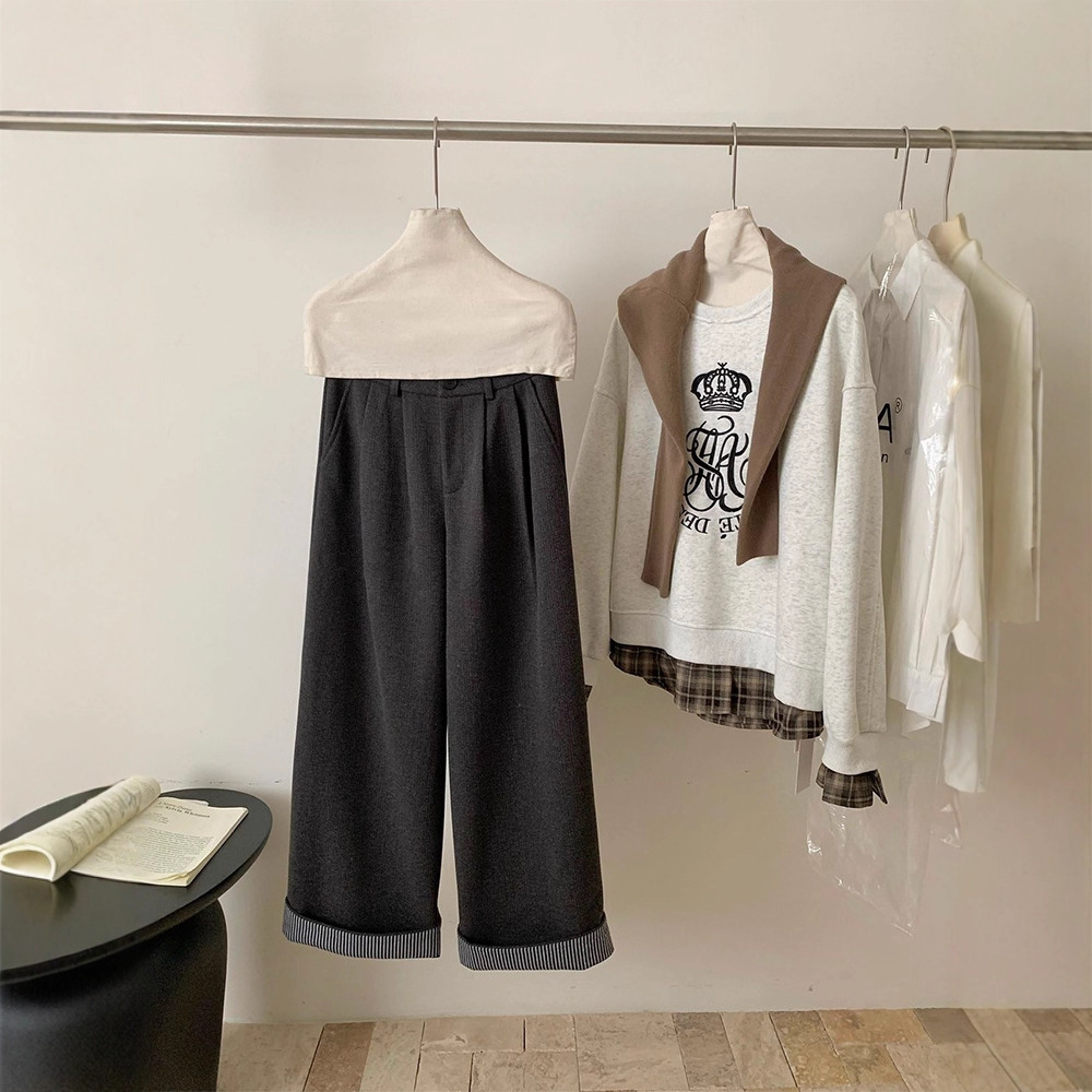 2025秋季新款深灰色呢;料阔腿裤女翻边宽松显瘦直筒休闲裤