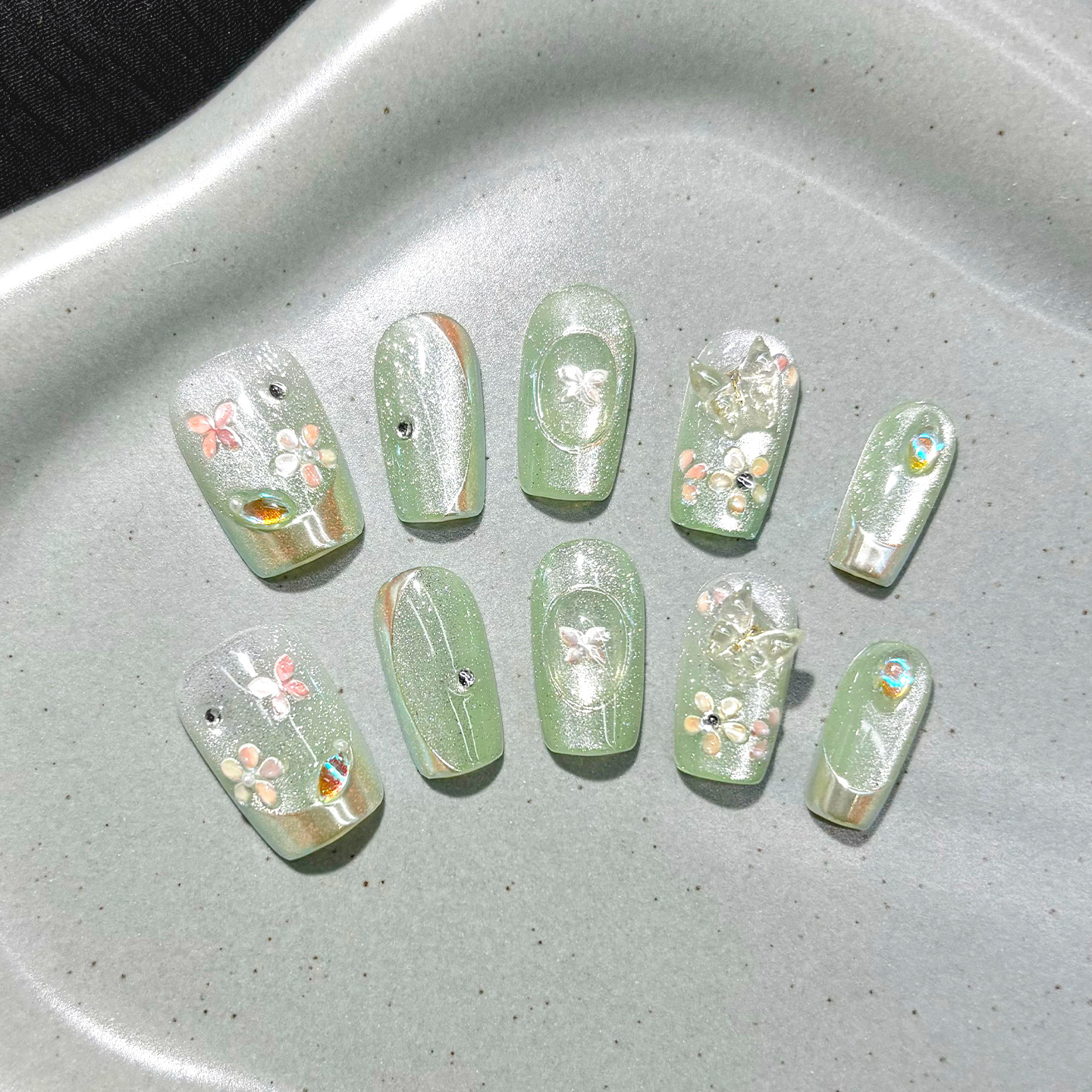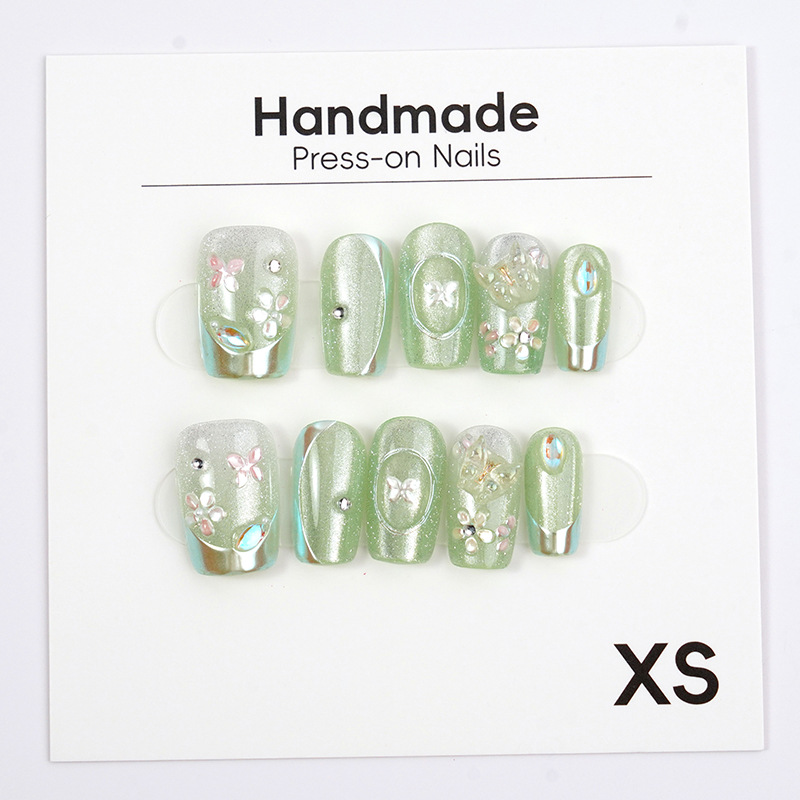 薄荷曼波手工穿戴甲中国风淡雅小花美甲甲片穿戴式高级感工厂批发