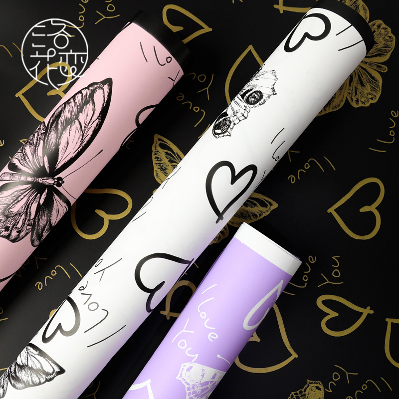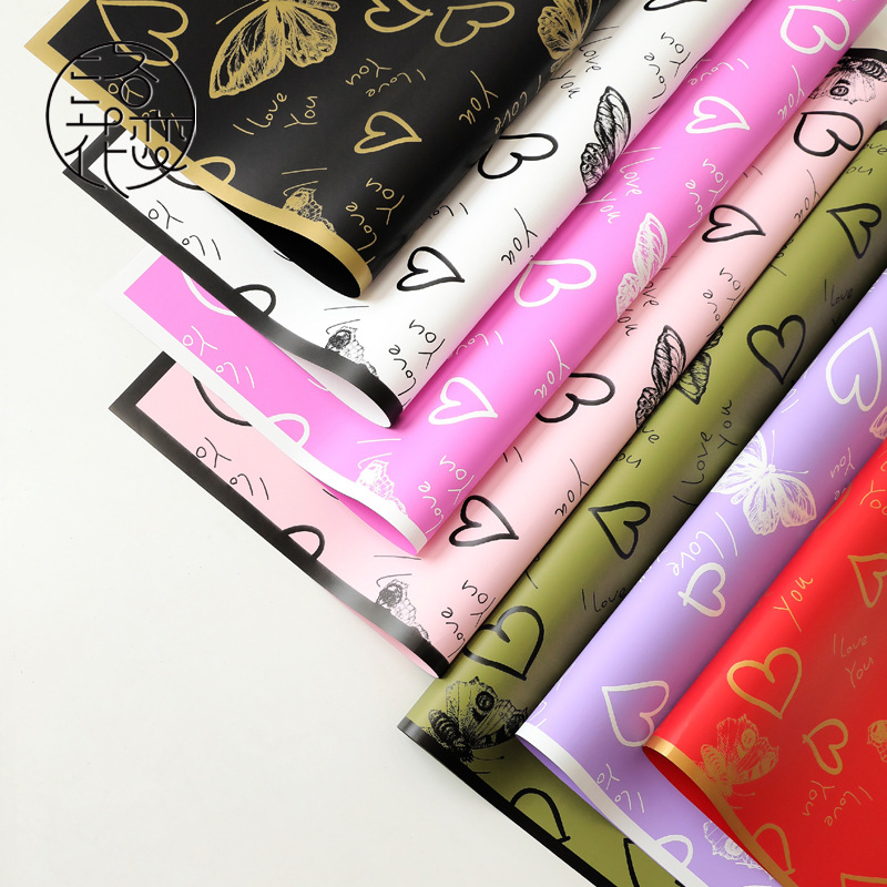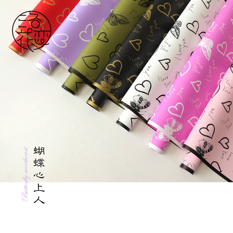 新款蝴蝶心上人花束包装纸轻奢心形加厚防水珠光膜鲜花包装纸