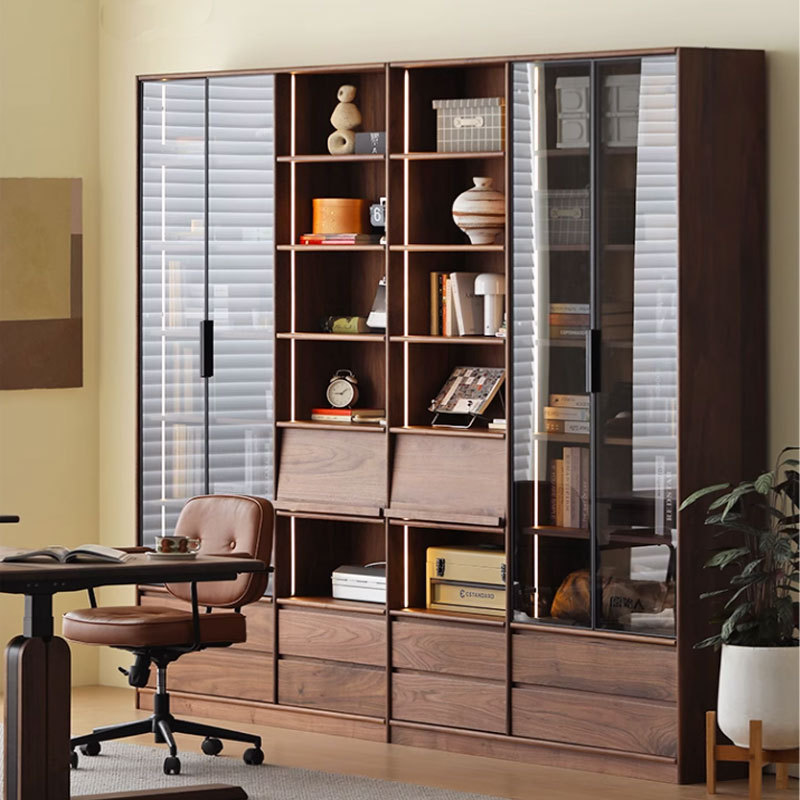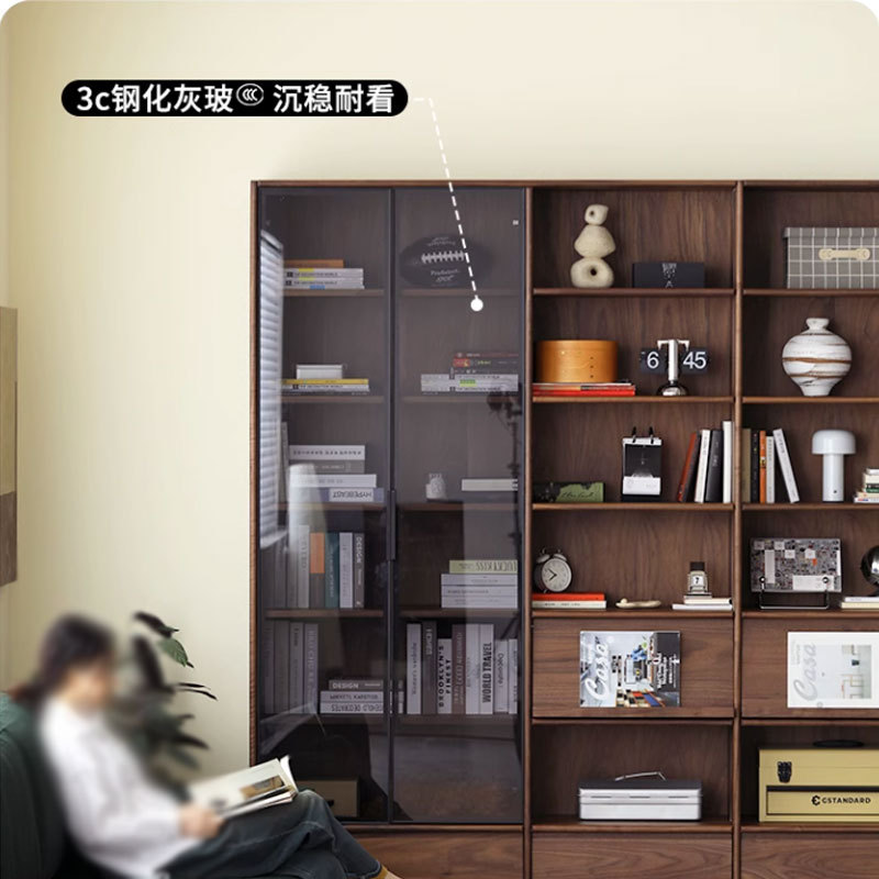 北美黑胡桃木组合书柜北欧简约实木满墙书架原木展示柜带玻璃门