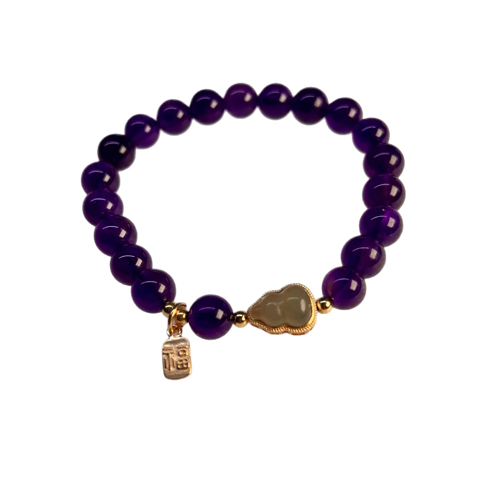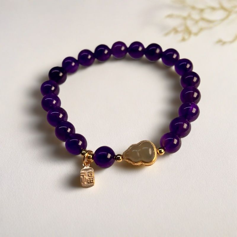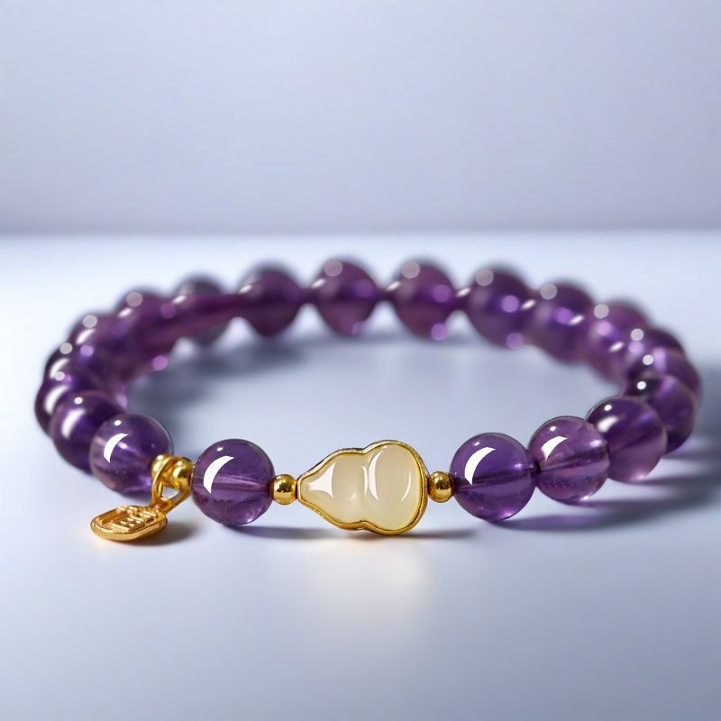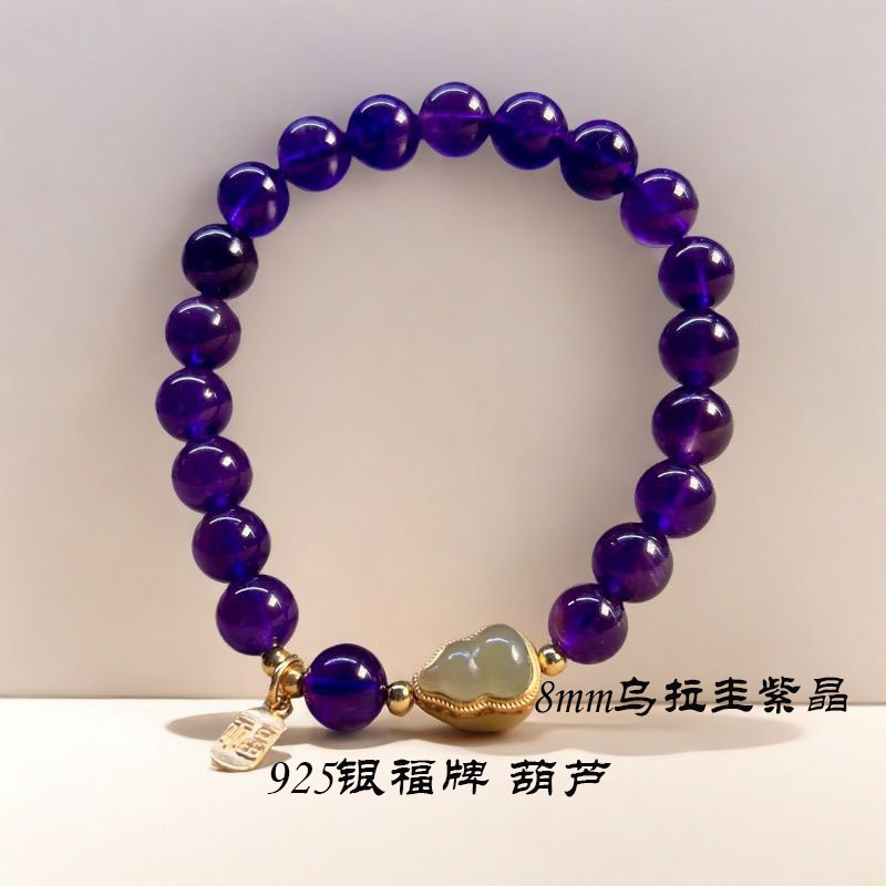 925银福牌 乌拉圭天然紫水晶手链女正品和田玉福禄葫芦转运珠手串