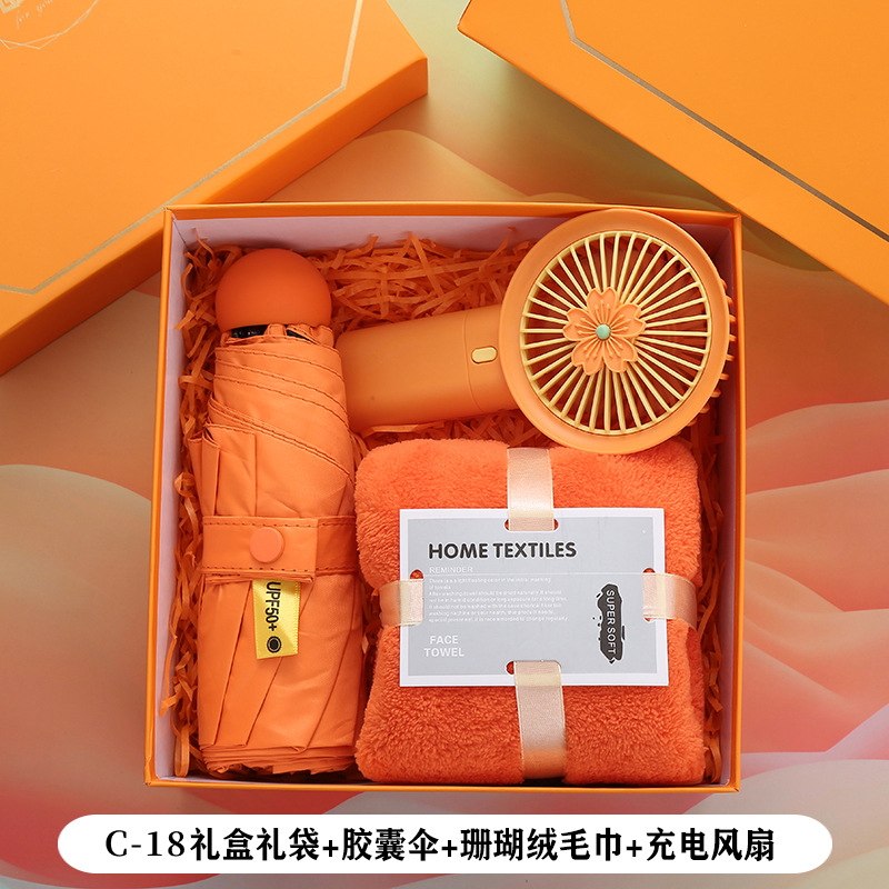 颜色 | C-17礼盒礼袋+胶囊伞+珊瑚绒毛巾+彩蛋加湿器 | | 颜色 | C-18礼盒礼袋+胶囊伞+珊瑚绒毛巾+充电风扇 |