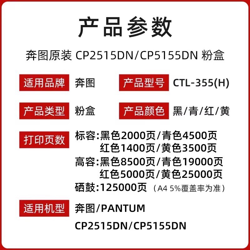 颜色 | 原装奔图CTL-350HY黄色高容粉盒 5000页 | | 颜色 | 原装奔图CTL-350H高容粉盒四色套装 |