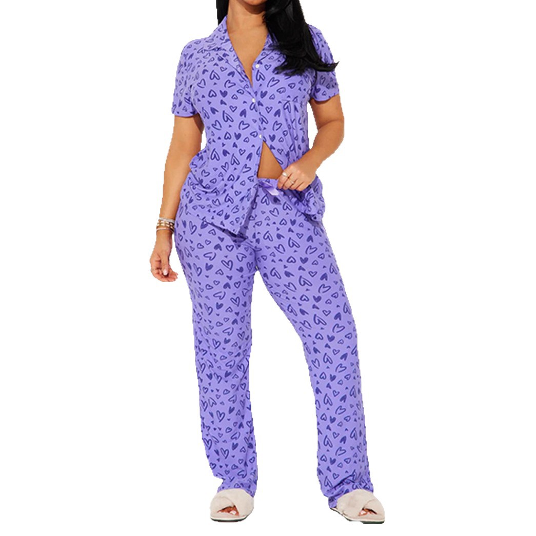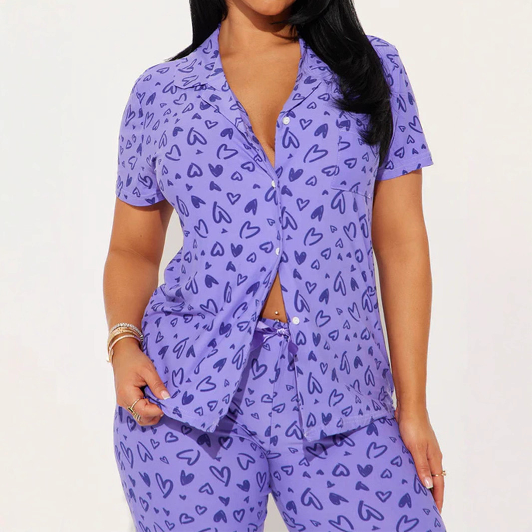 2025夏季跨境休闲女装家居舒适短袖前开襟纽扣松紧长裤套装3D印花