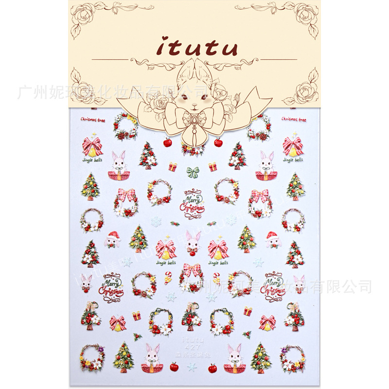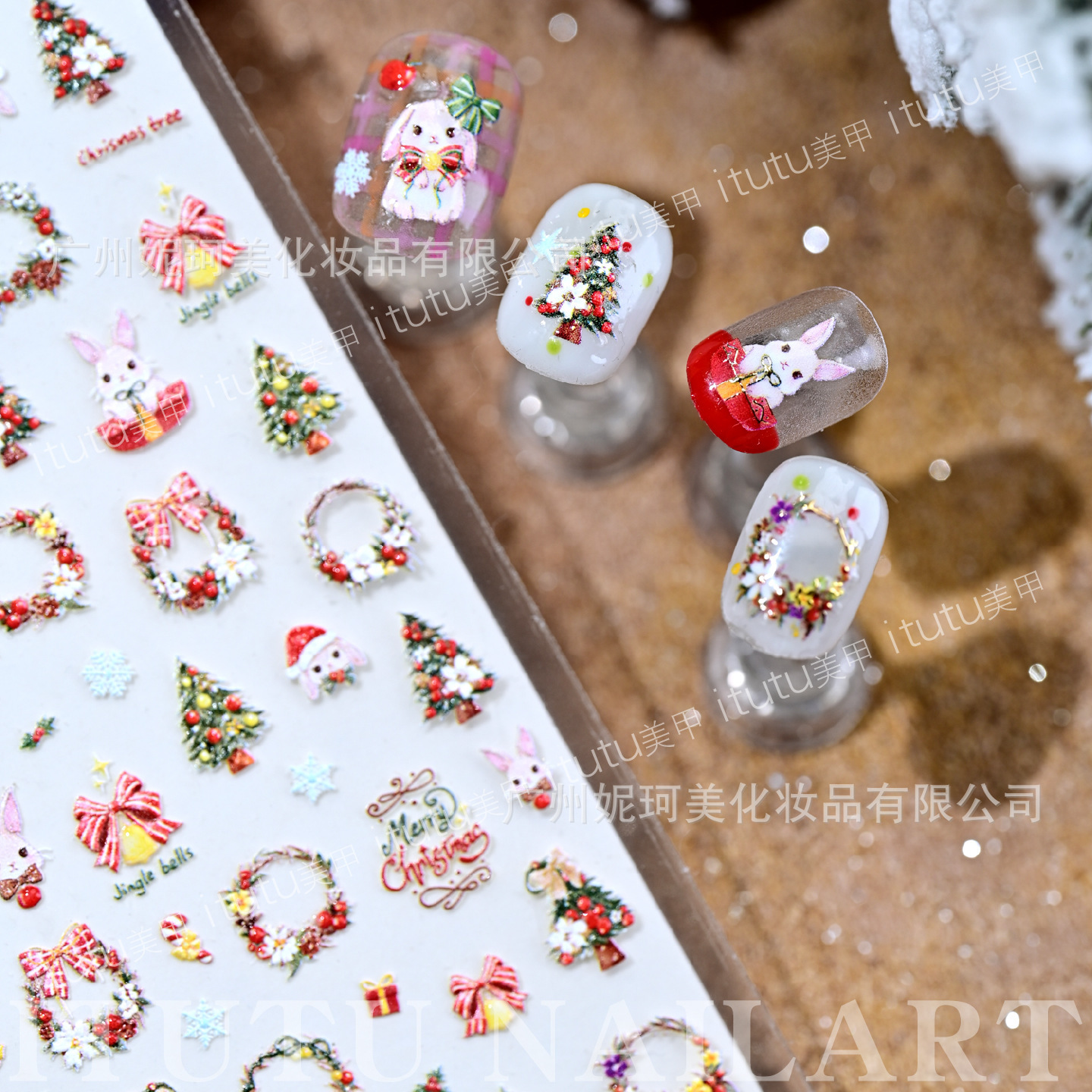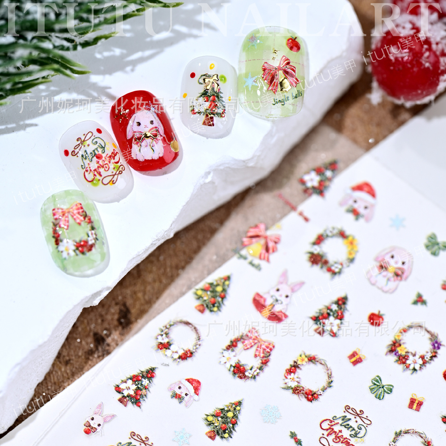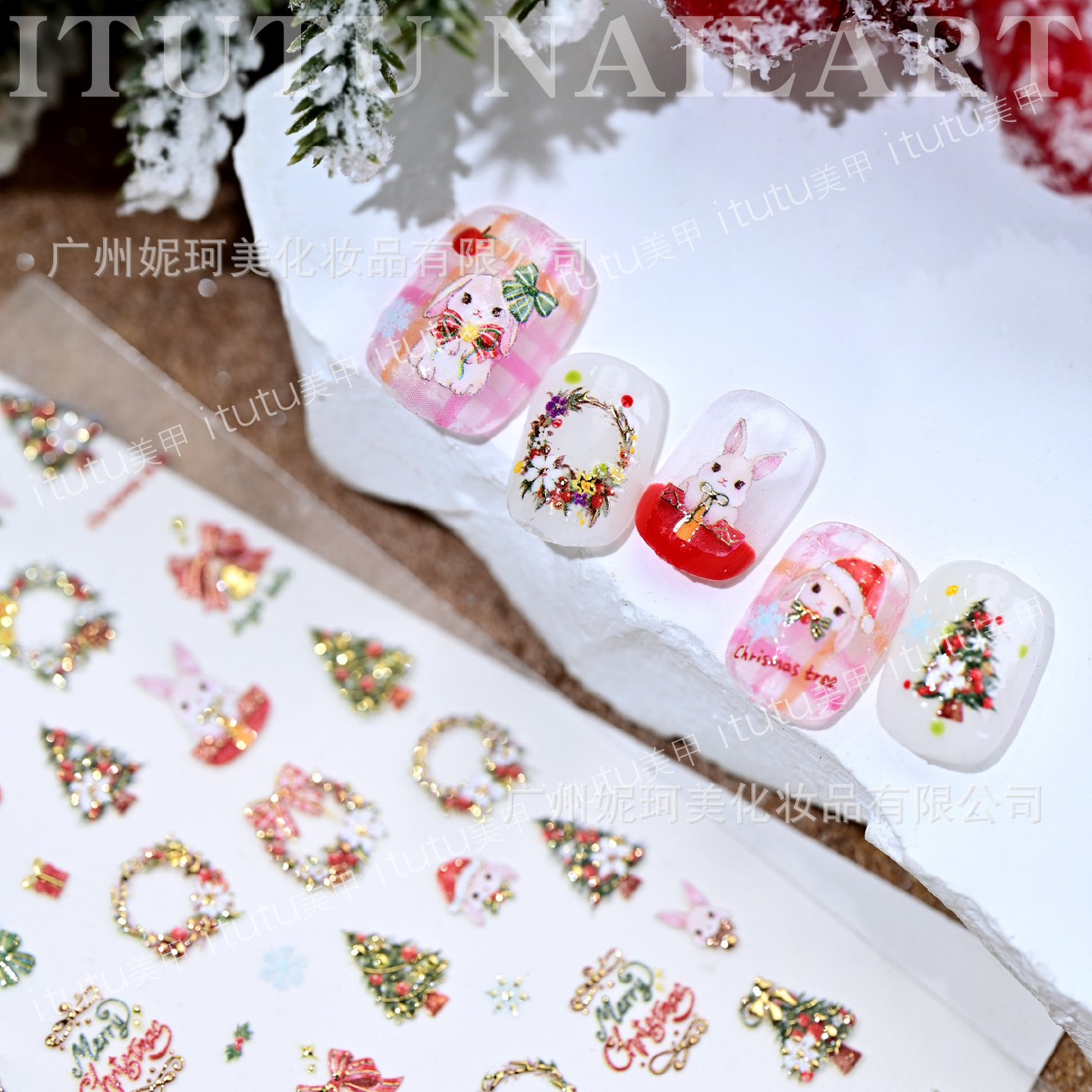 新款美甲贴纸2025圣诞节款式高级烫金圣诞树蝴蝶结背胶指甲装饰贴