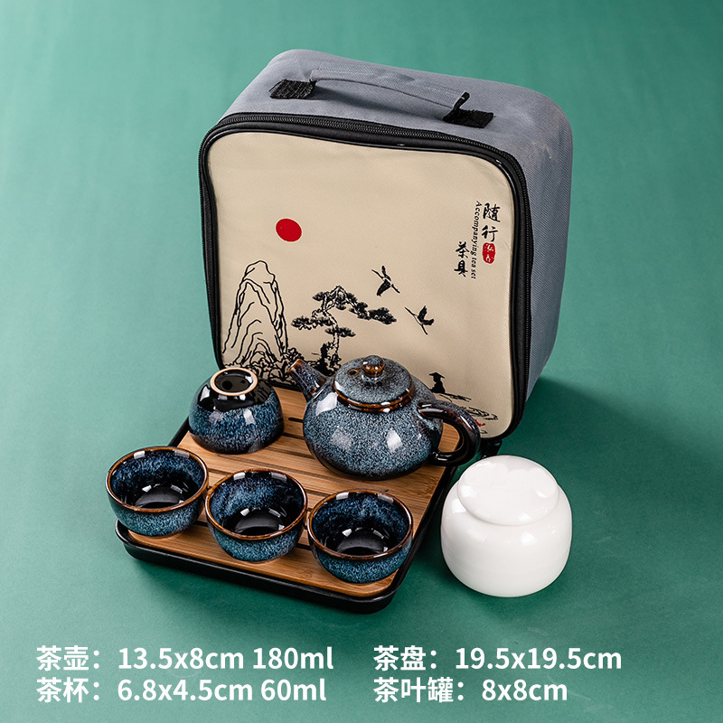 | 颜色 | 黑紫砂一壶四杯+白盘+罐+山水包 | 颜色 | 青瓷鱼一壶四杯+白盘+罐+山水包 |