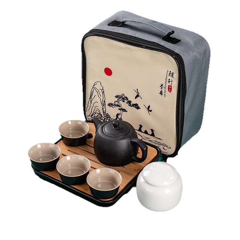 | 颜色 | 黑陶井栏壶一壶四杯+白盘+罐+山水包 | 颜色 | 黑紫砂一壶四杯 |