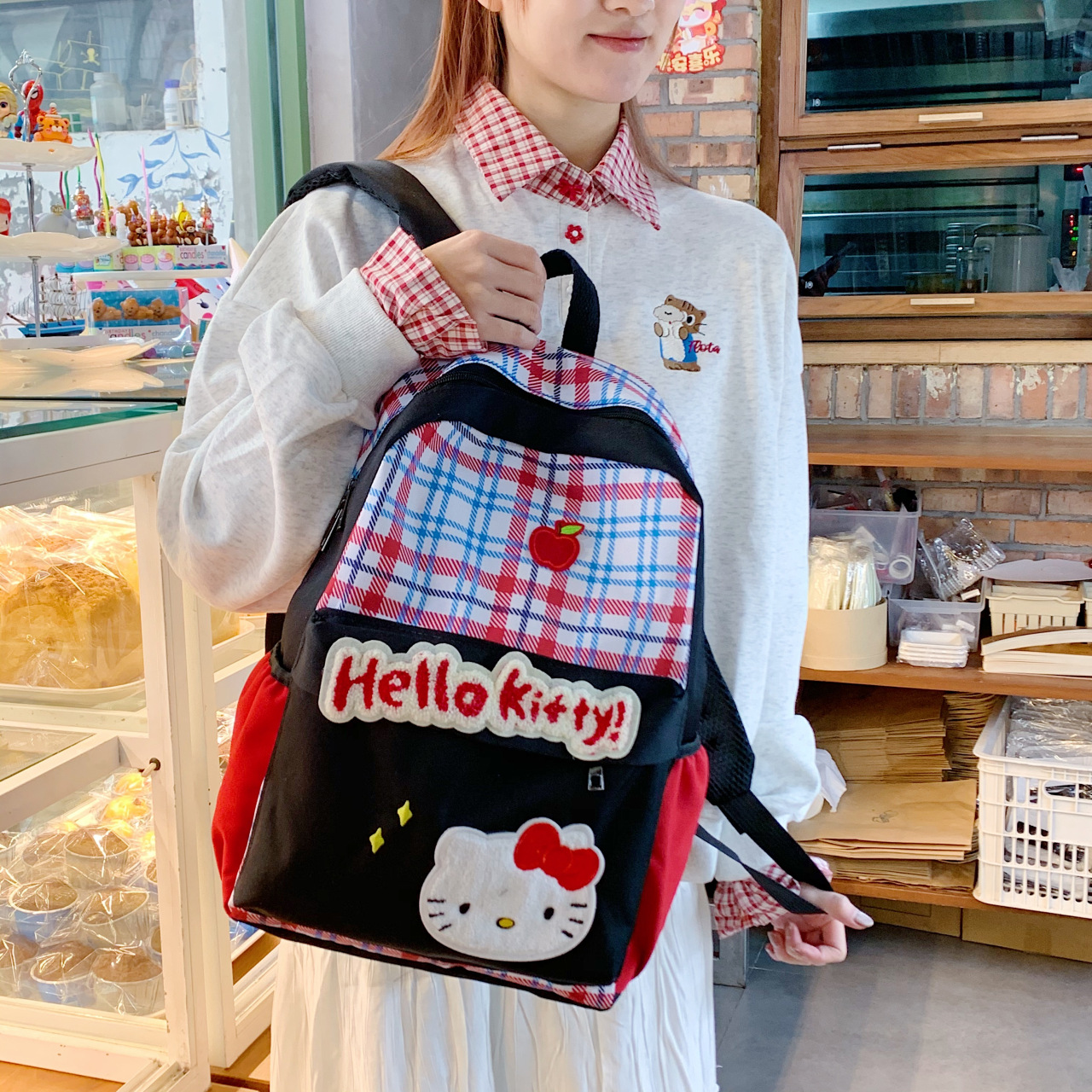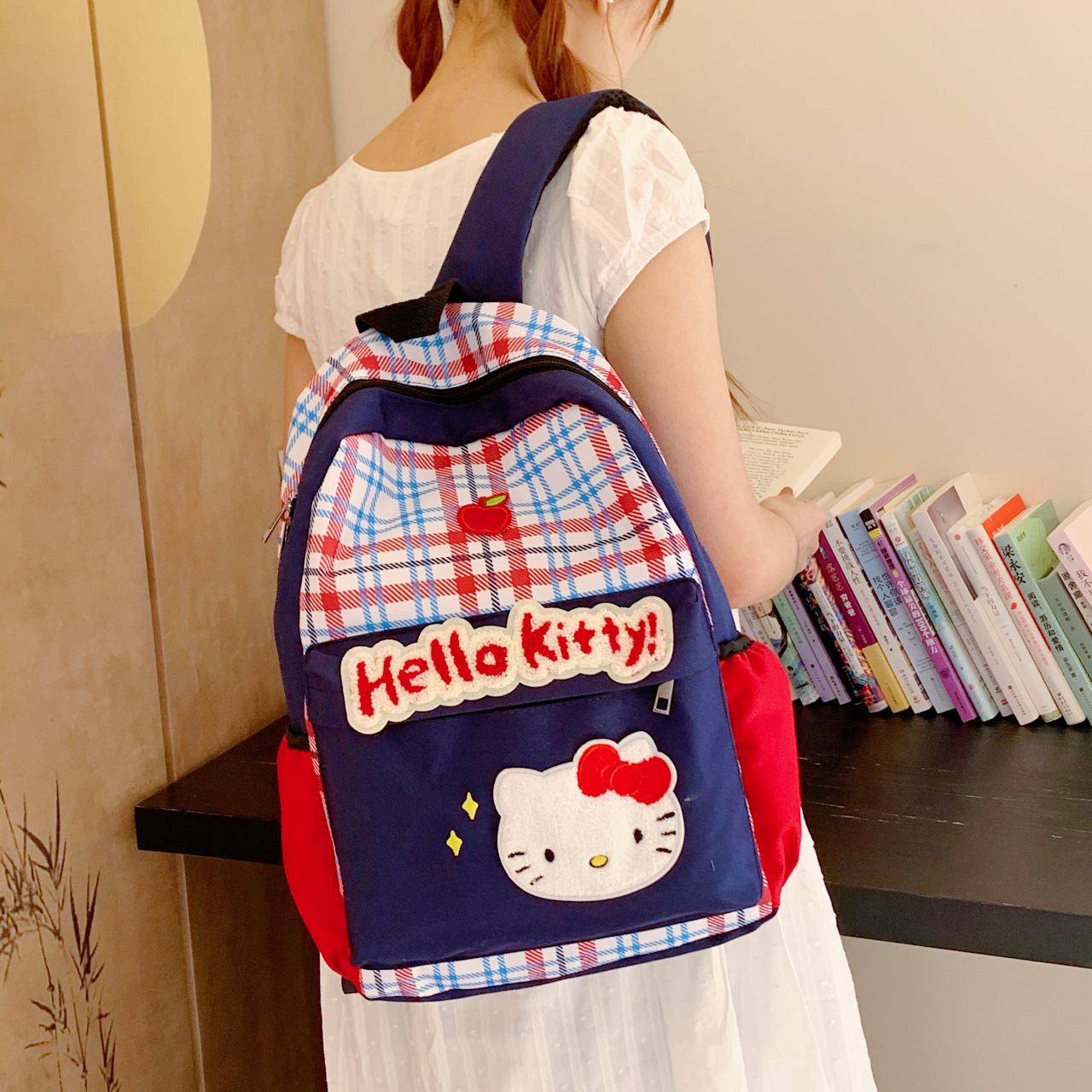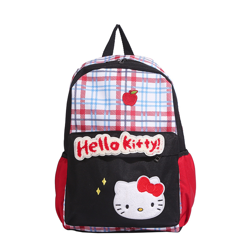 美式少女复古蓝格绣花卡通书包初高中大容量休闲双肩包