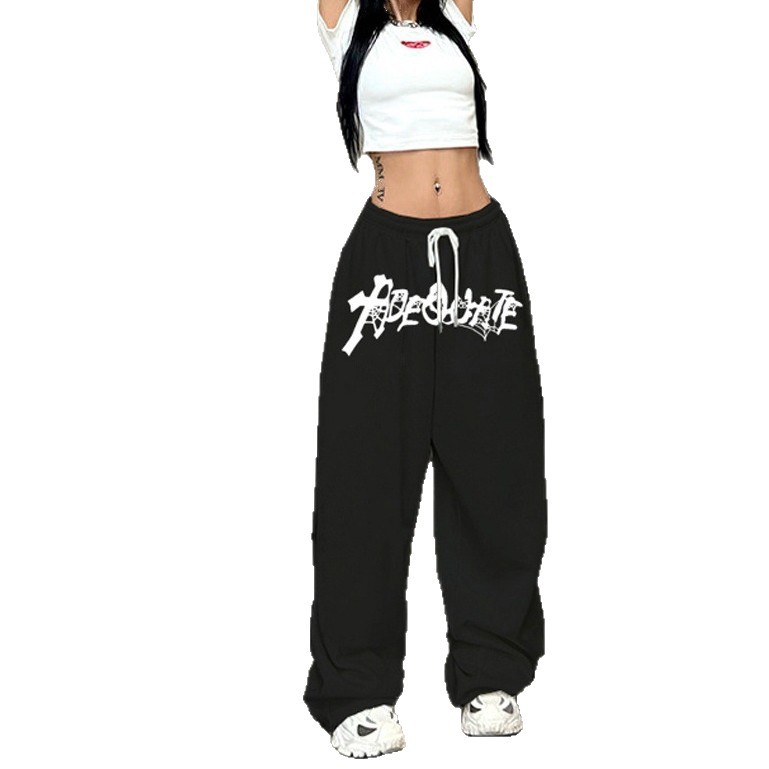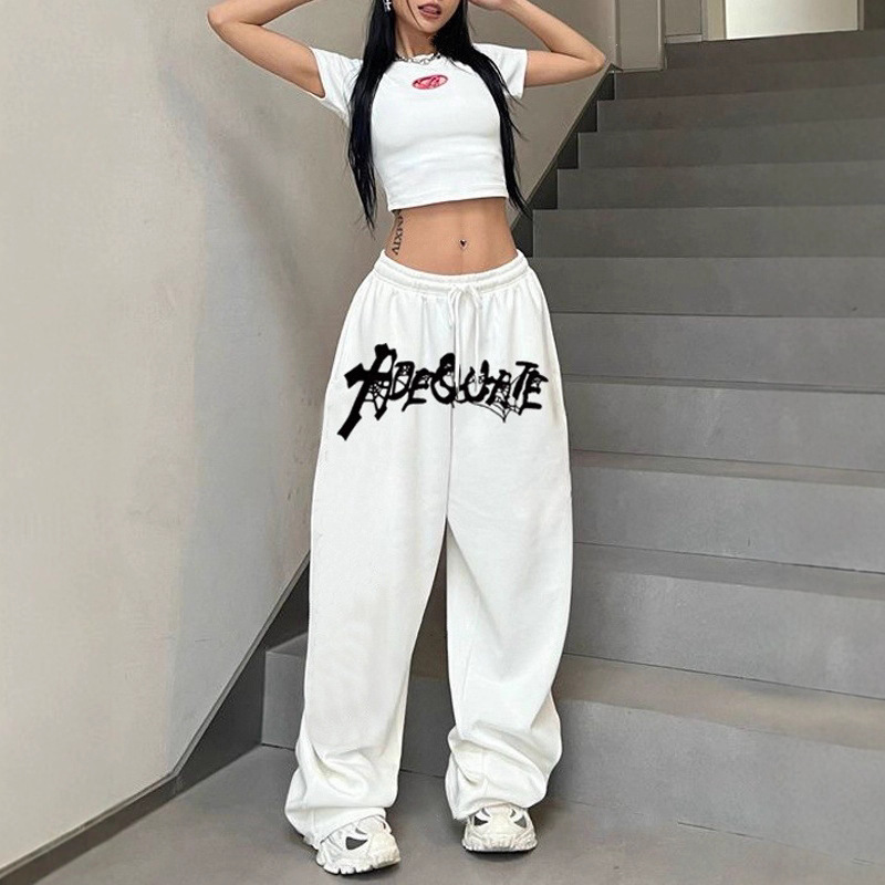2024新款美式白色嘻哈爵士舞高腰宽松直筒阔腿抽绳运动裤子3D印花