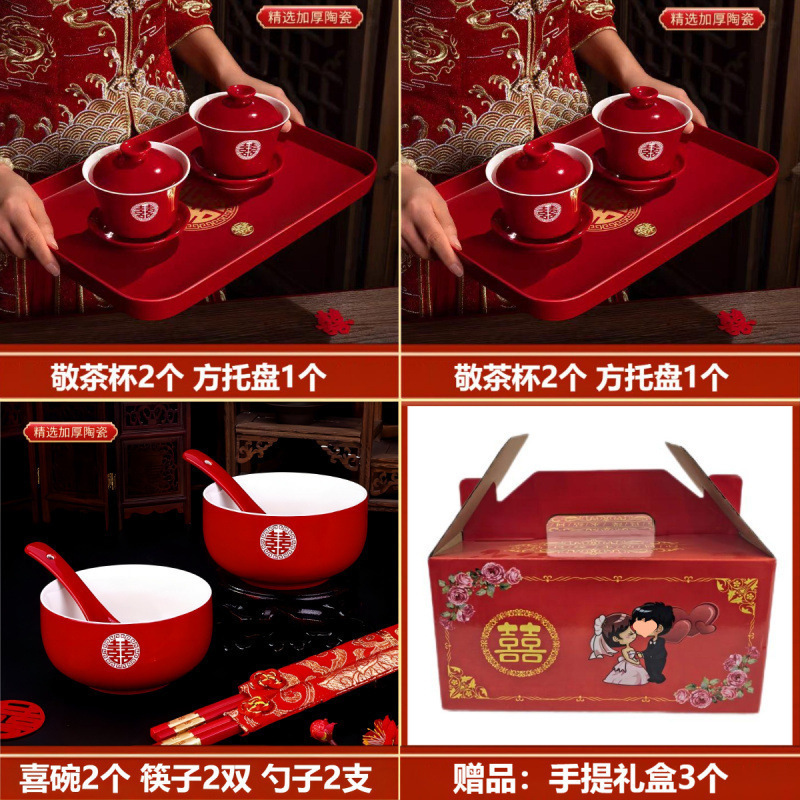 婚礼敬茶杯结婚全套改口杯盖碗喜碗套装红碗筷一整套喜事家用大全