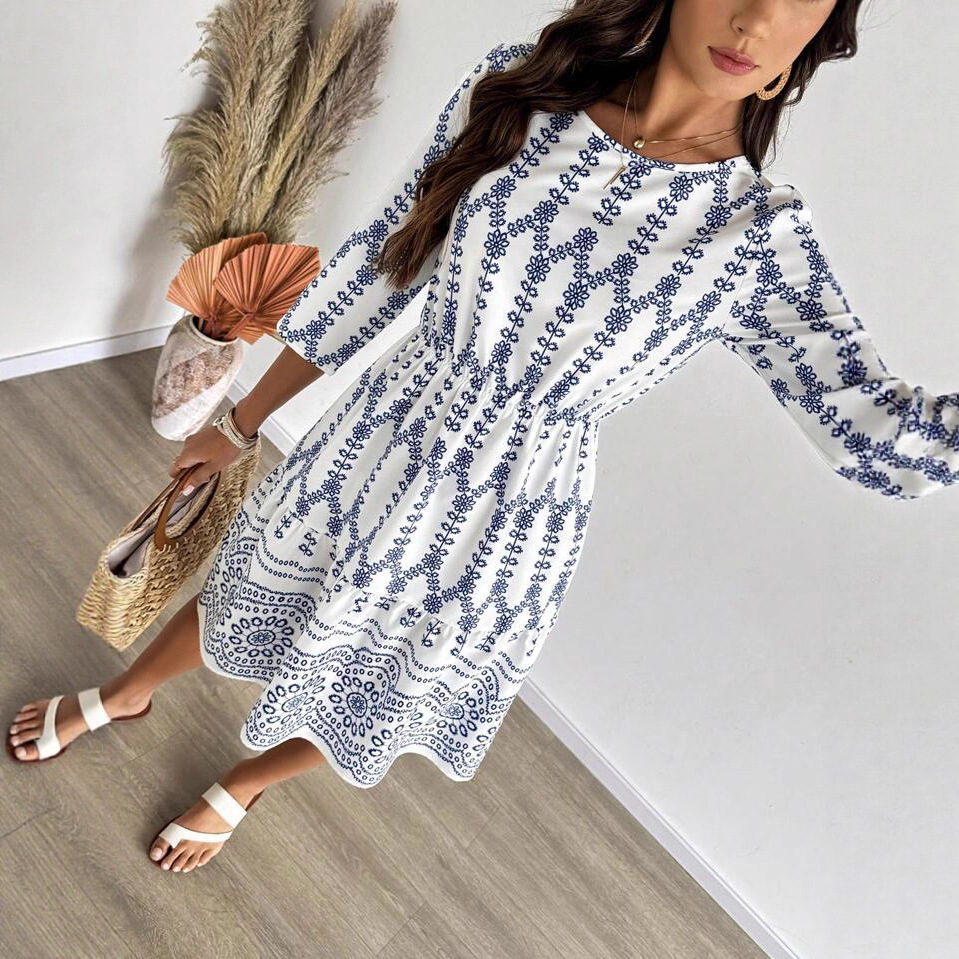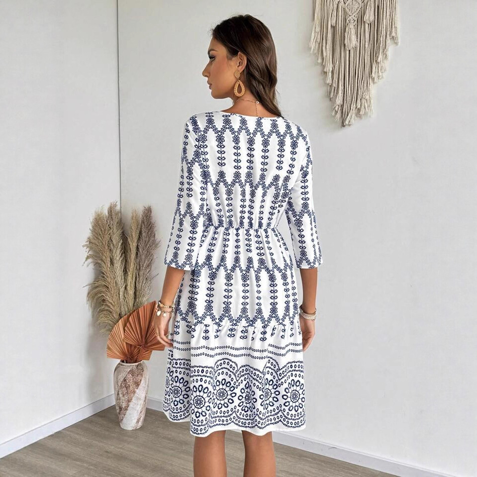 欧美跨境独立站波西米亚女装度假风夏季时尚花卉印花七分袖连衣裙