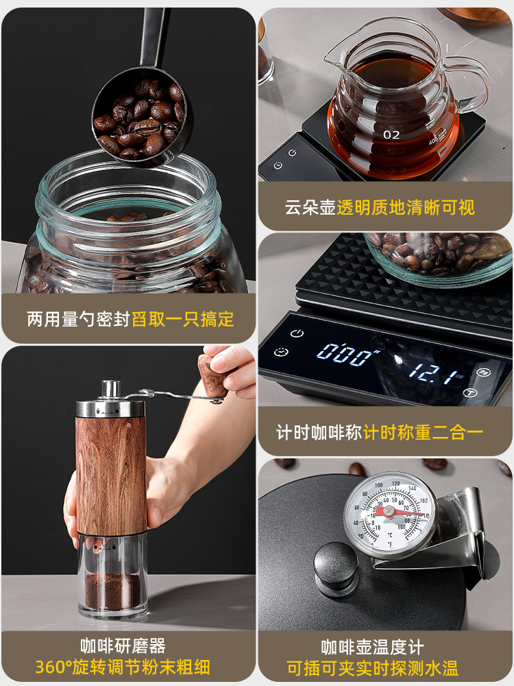 | 颜色 | 【含电子秤 刻度】进阶套装(八件套) | 颜色 | 【含温度计 把控水温】高阶套装(九件套) |