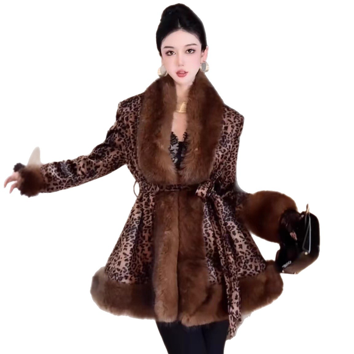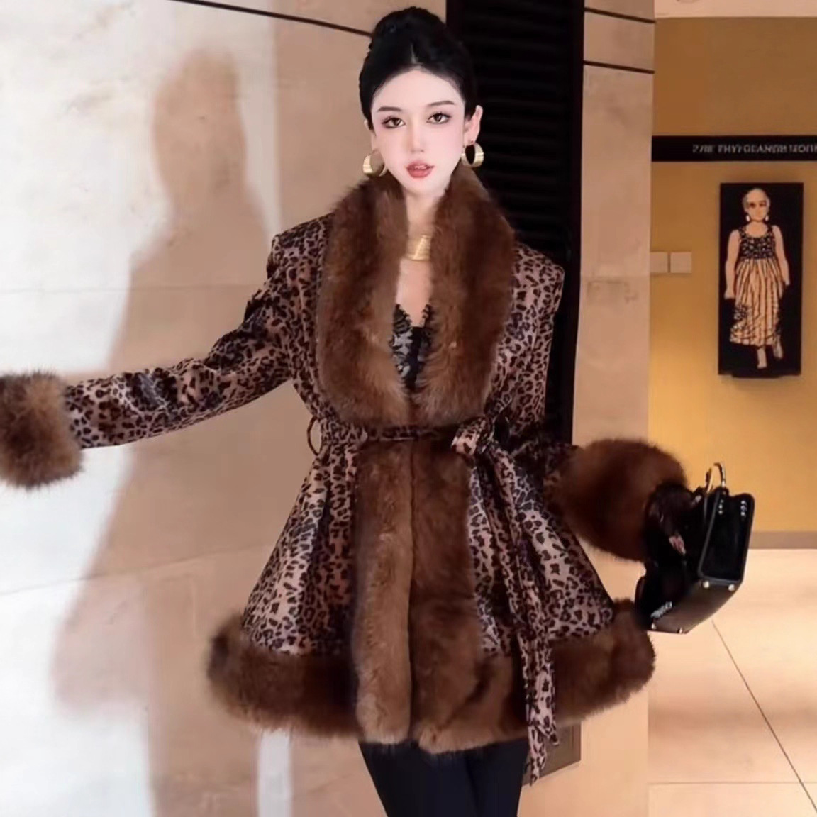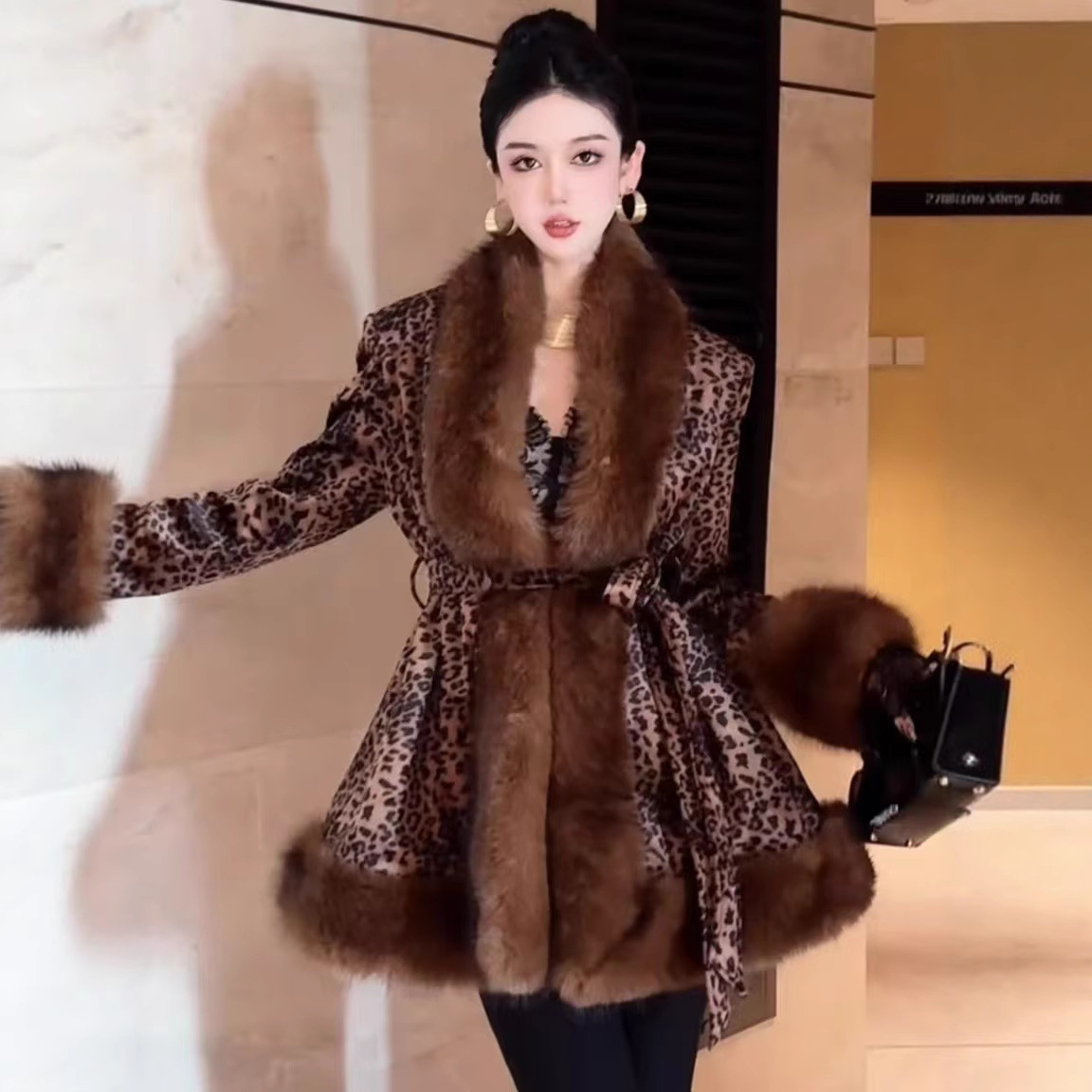 秋冬新款豹纹仿皮草大毛领皮毛一体中长款仿水貂毛绒皮草大衣外套