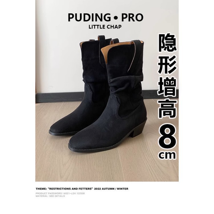 跨境堆堆靴粗跟新款牛2025褶皱圆头秋冬复古西部翻皮女靴中筒靴靴