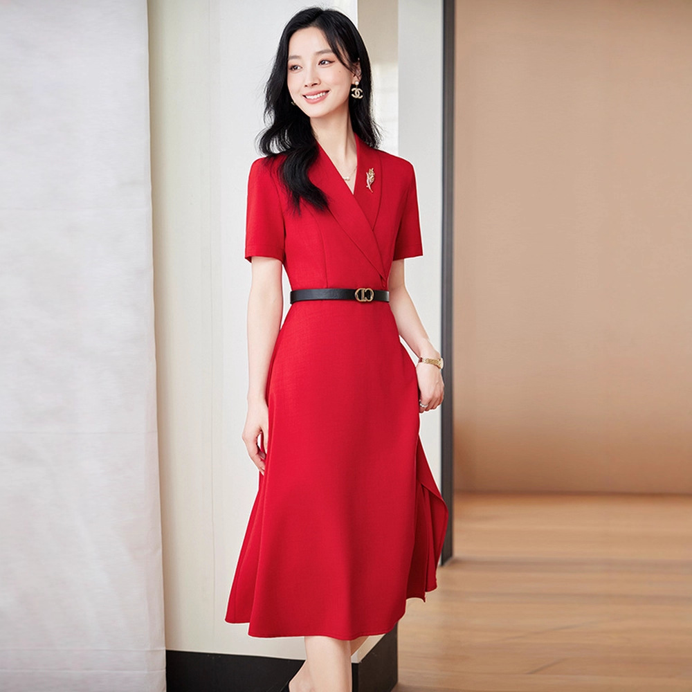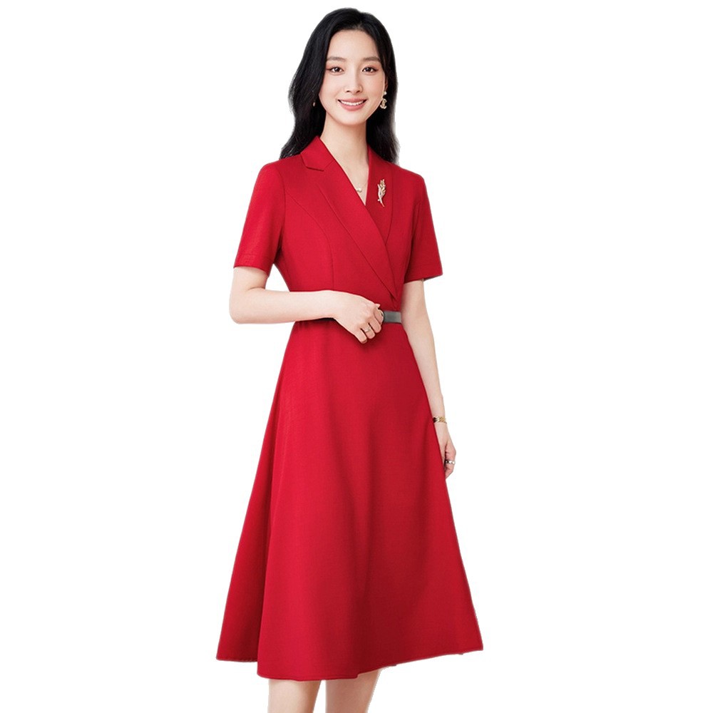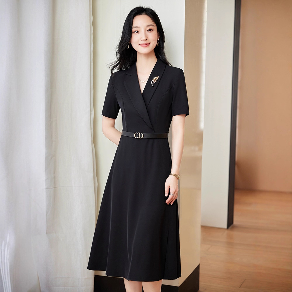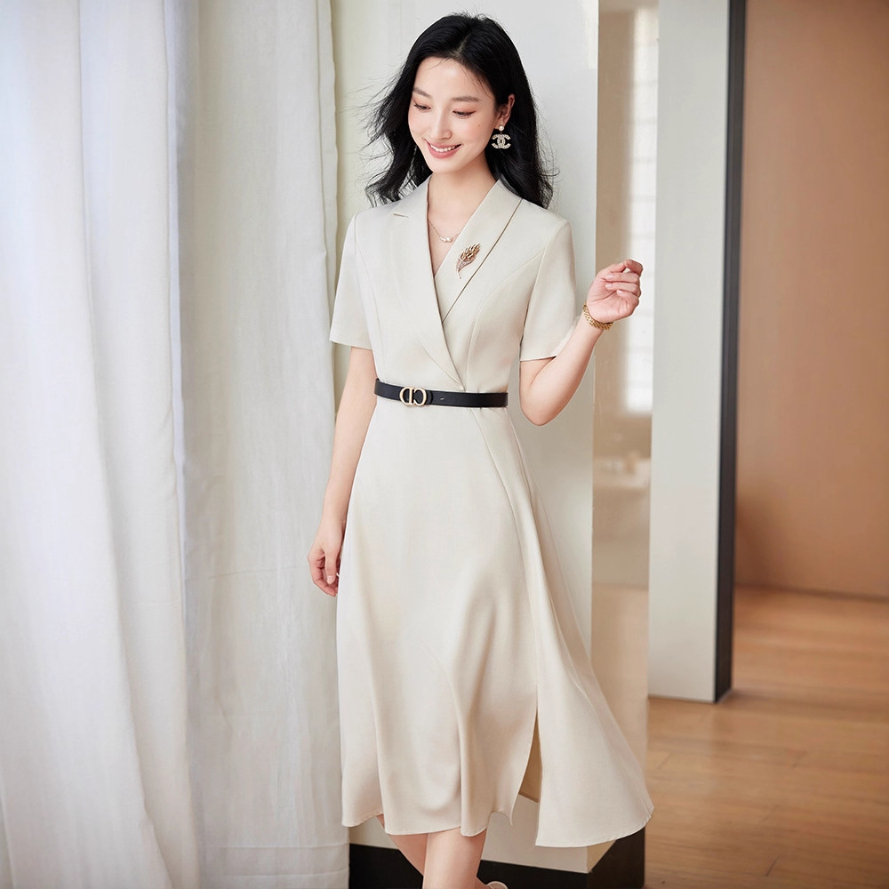 杏色短袖西装连衣裙女夏季新款通勤收腰职业通勤裙子美容院工装