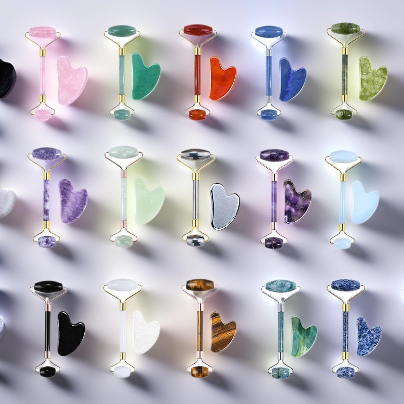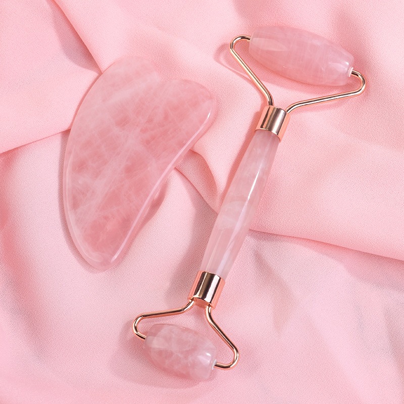 双头玉石粉晶滚轮刮板脸部美容棒石英石玉石按摩器Roller Gua Sha