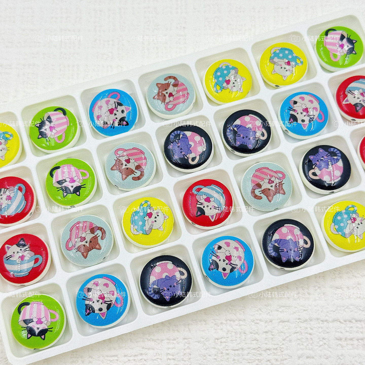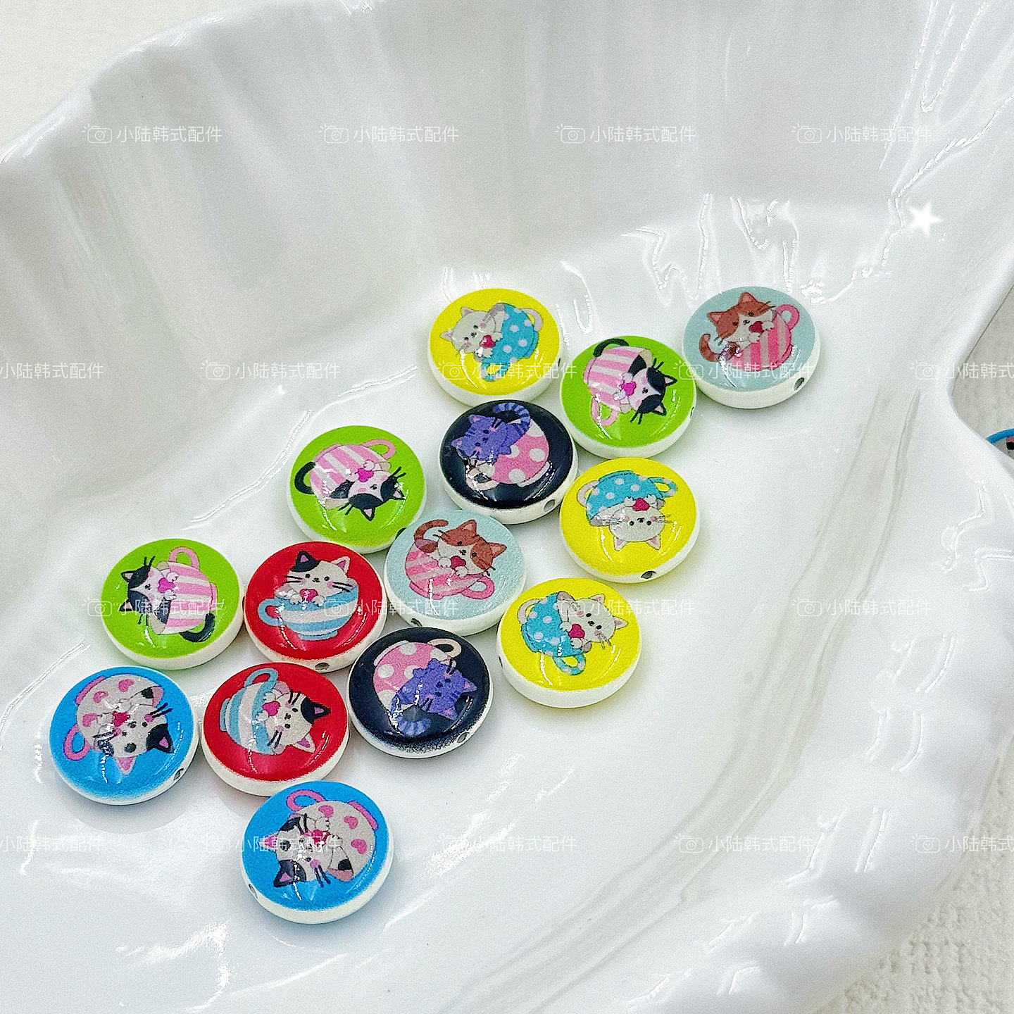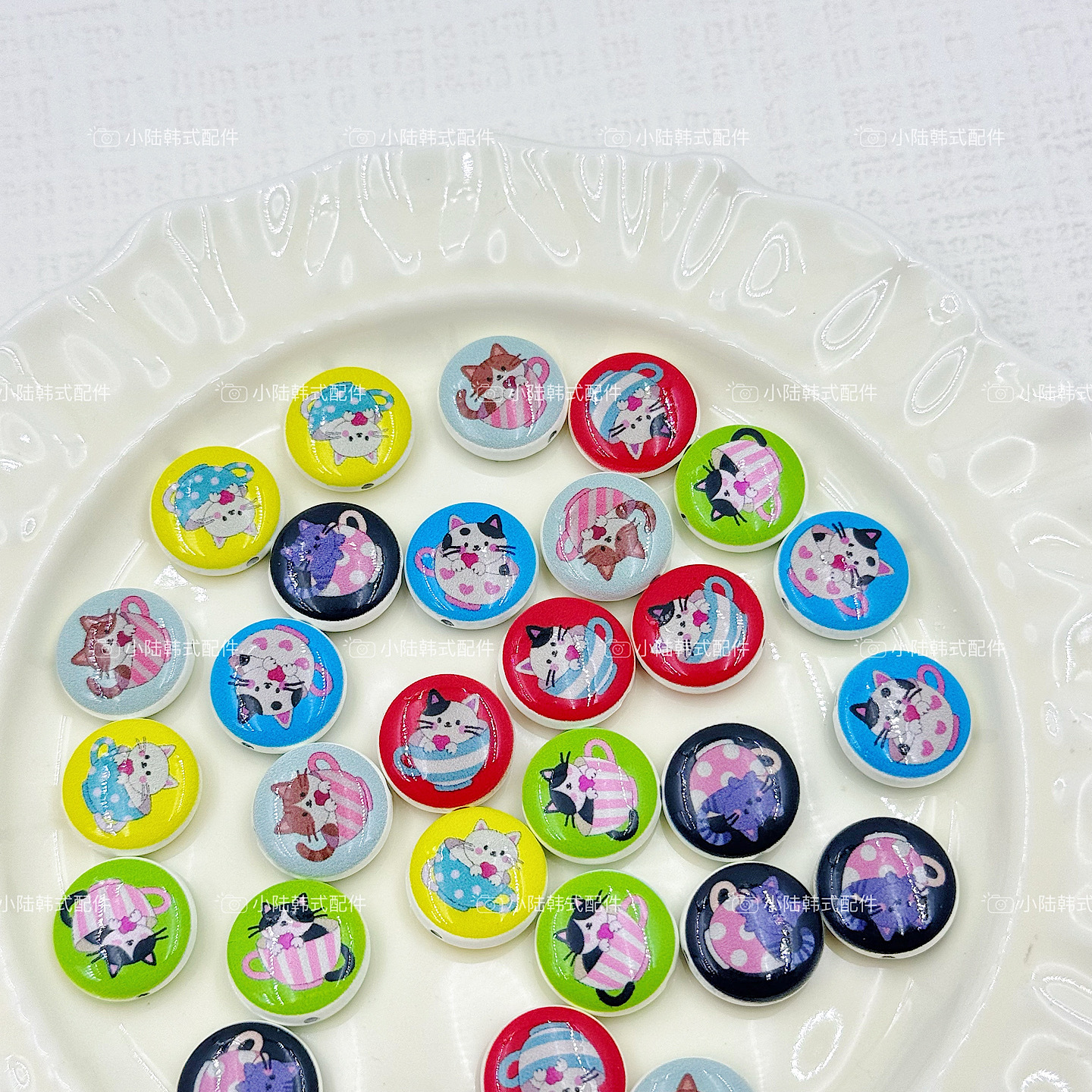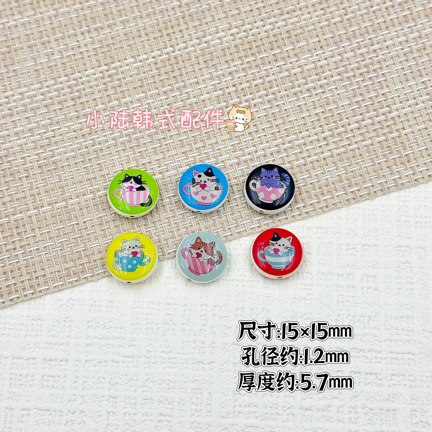15mm圆形印刷茶杯小猫烤漆合金串散珠手机链项链吊坠发夹饰品配件