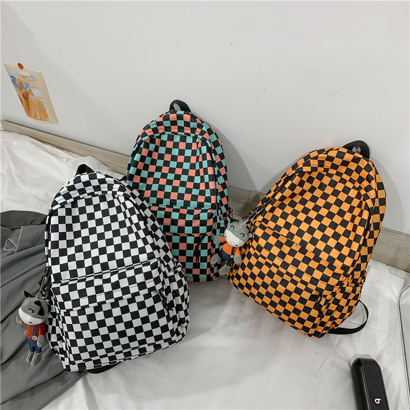 新款简约超轻黑白棋盘格帆布包女大容量双肩背包中小学生书包批发