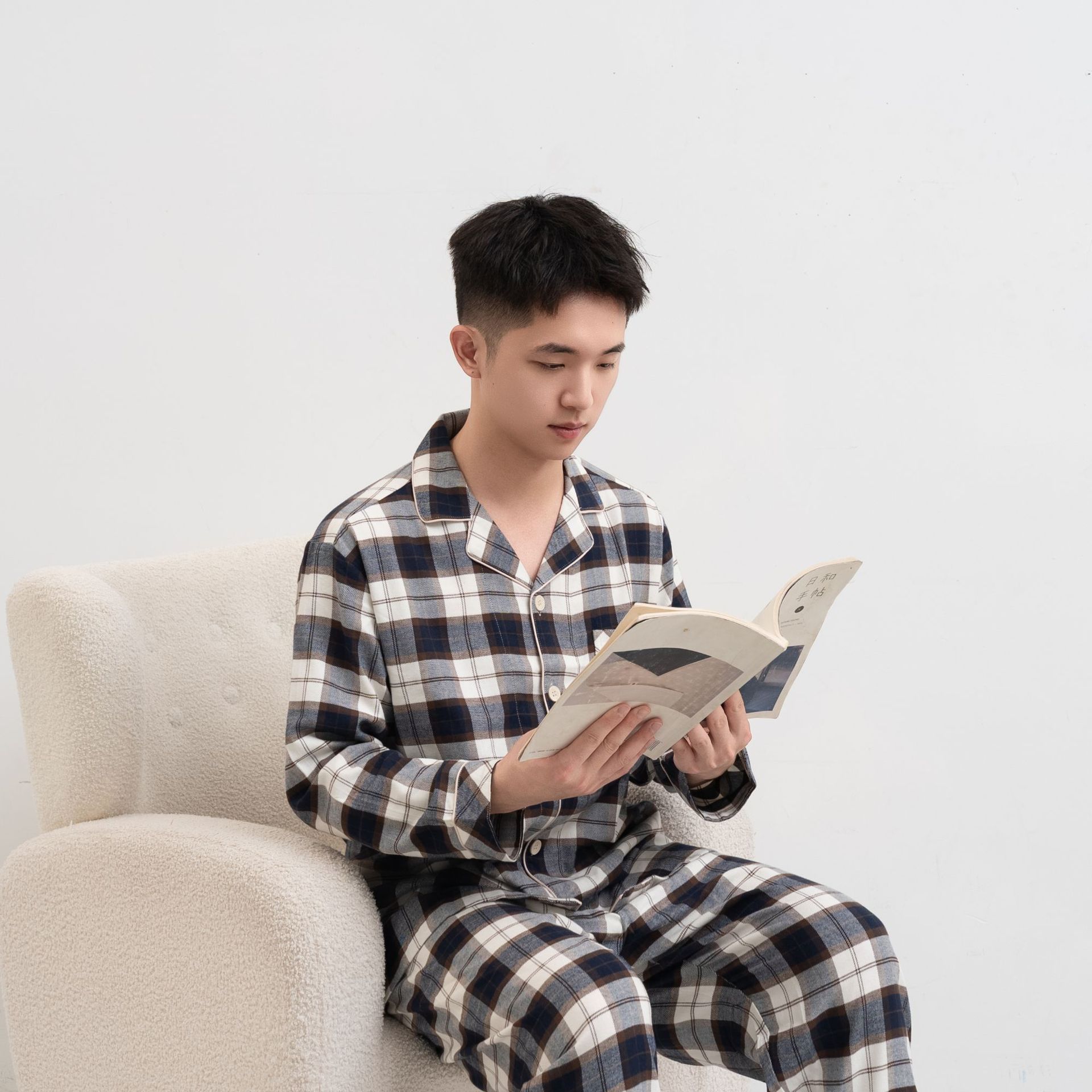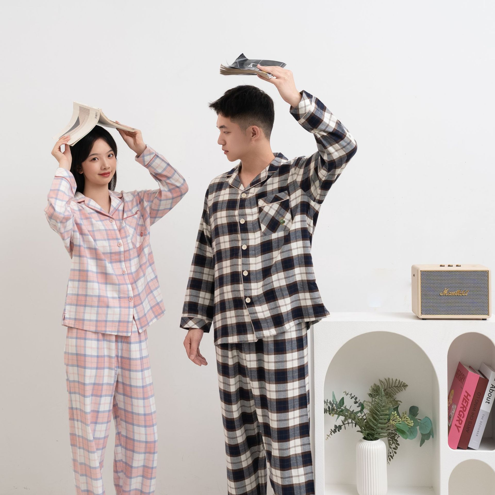 五印风家居格子全棉简约休闲情侣套装秋冬款男女士长袖纯棉家居服