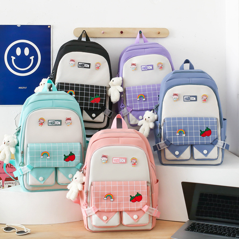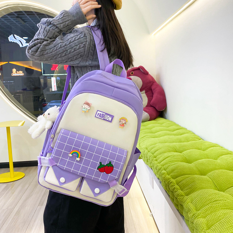 森系韩版学生书包大容量撞色双肩包五件套初中高中小学生背包