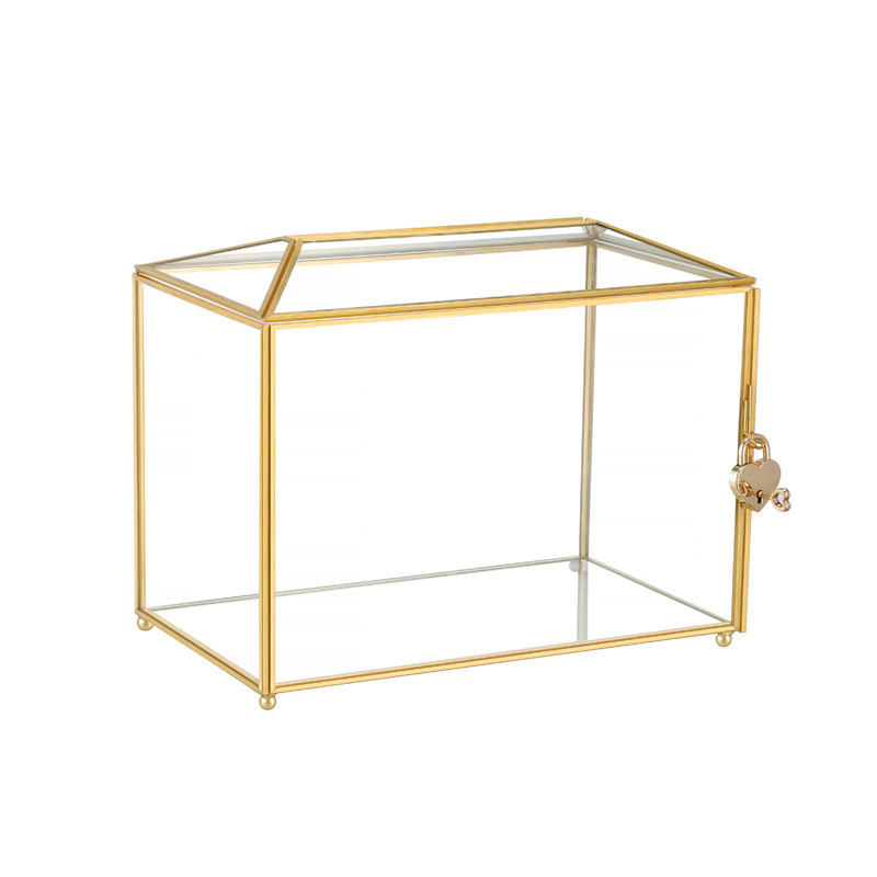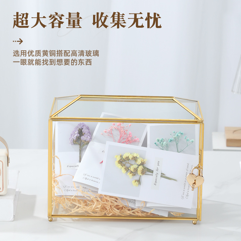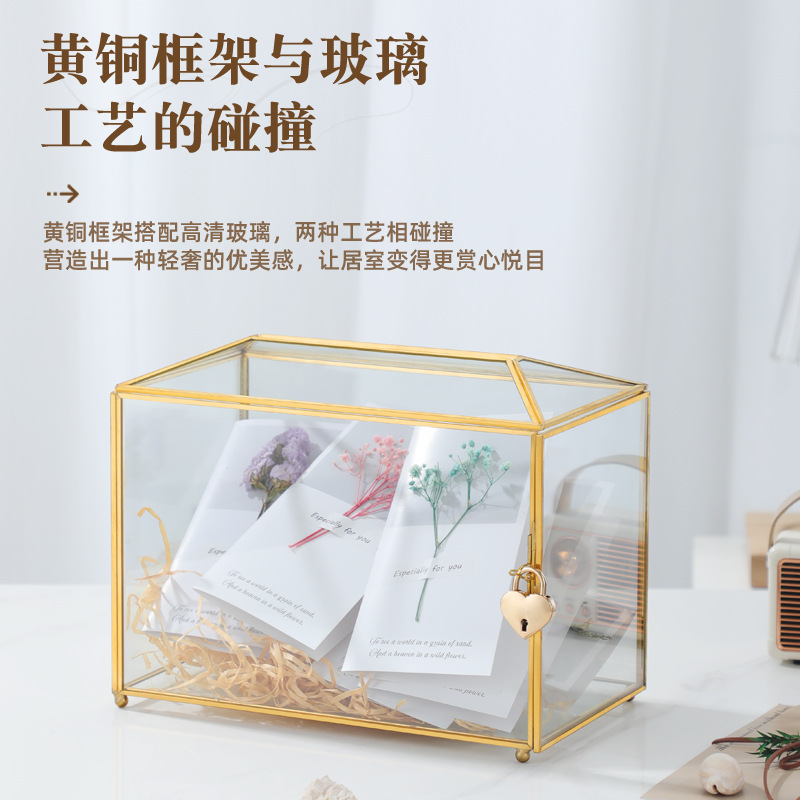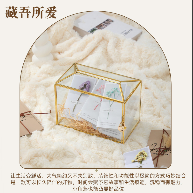 欧式金色边框玻璃收纳盒带心形锁,生日贺卡,结婚,情人化妆品