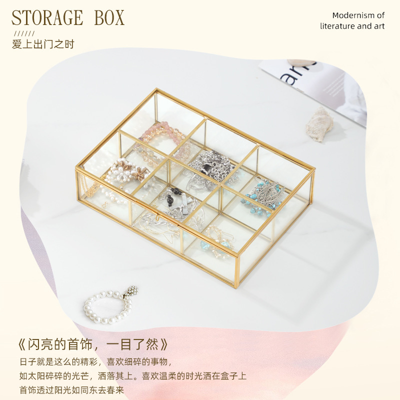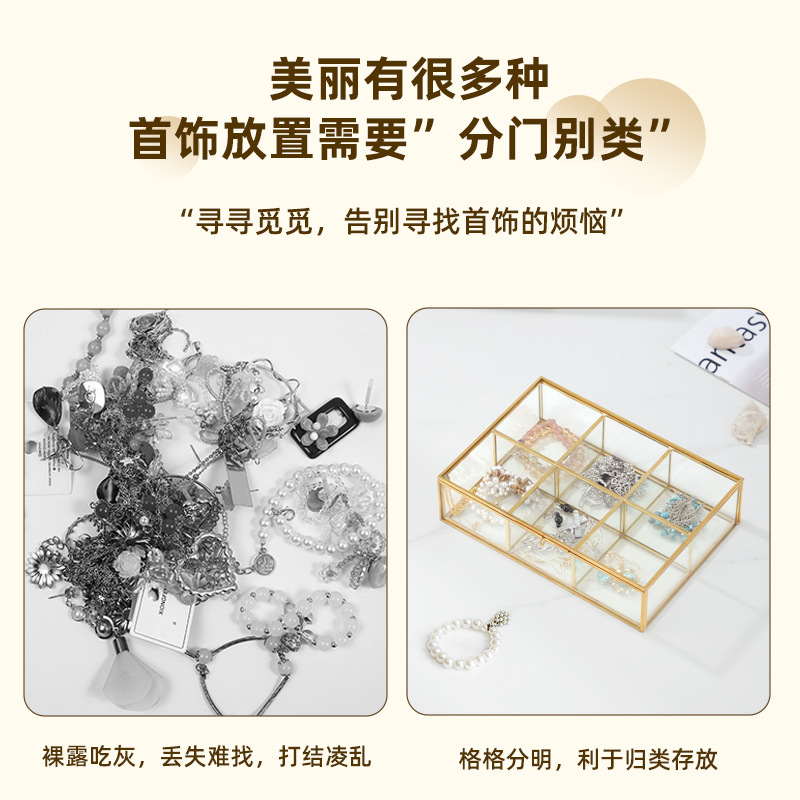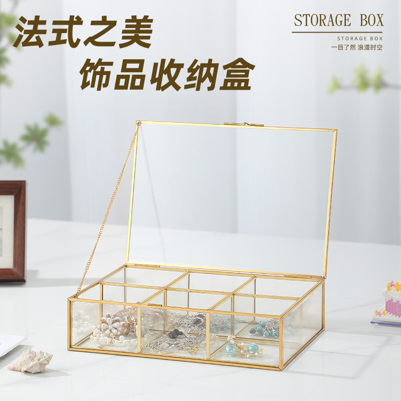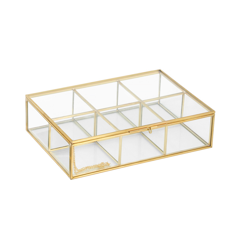 开合封闭式跨界热销6格珠宝首饰化妆品玻璃收纳盒金色铜质边框