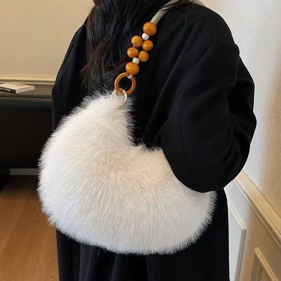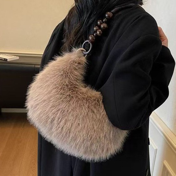 毛绒单肩包女芙拉风软质水饺型腋下包链条串珠拼接日常搭配新款