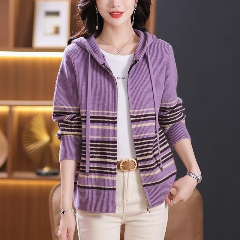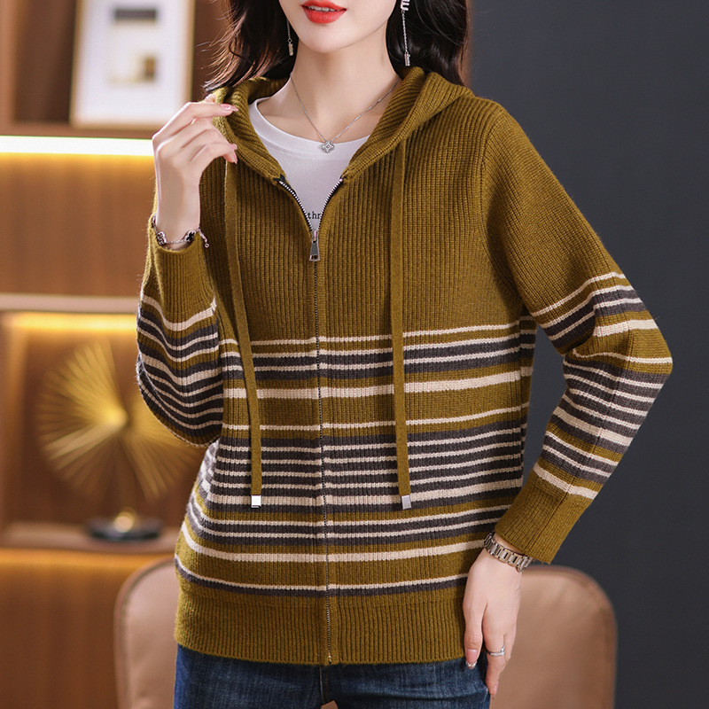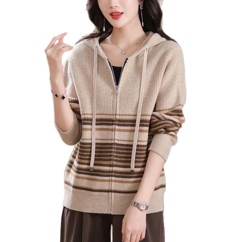 秋冬跨境新款韩版连帽拉链长袖针织开衫女士撞色条纹上衣外套潮