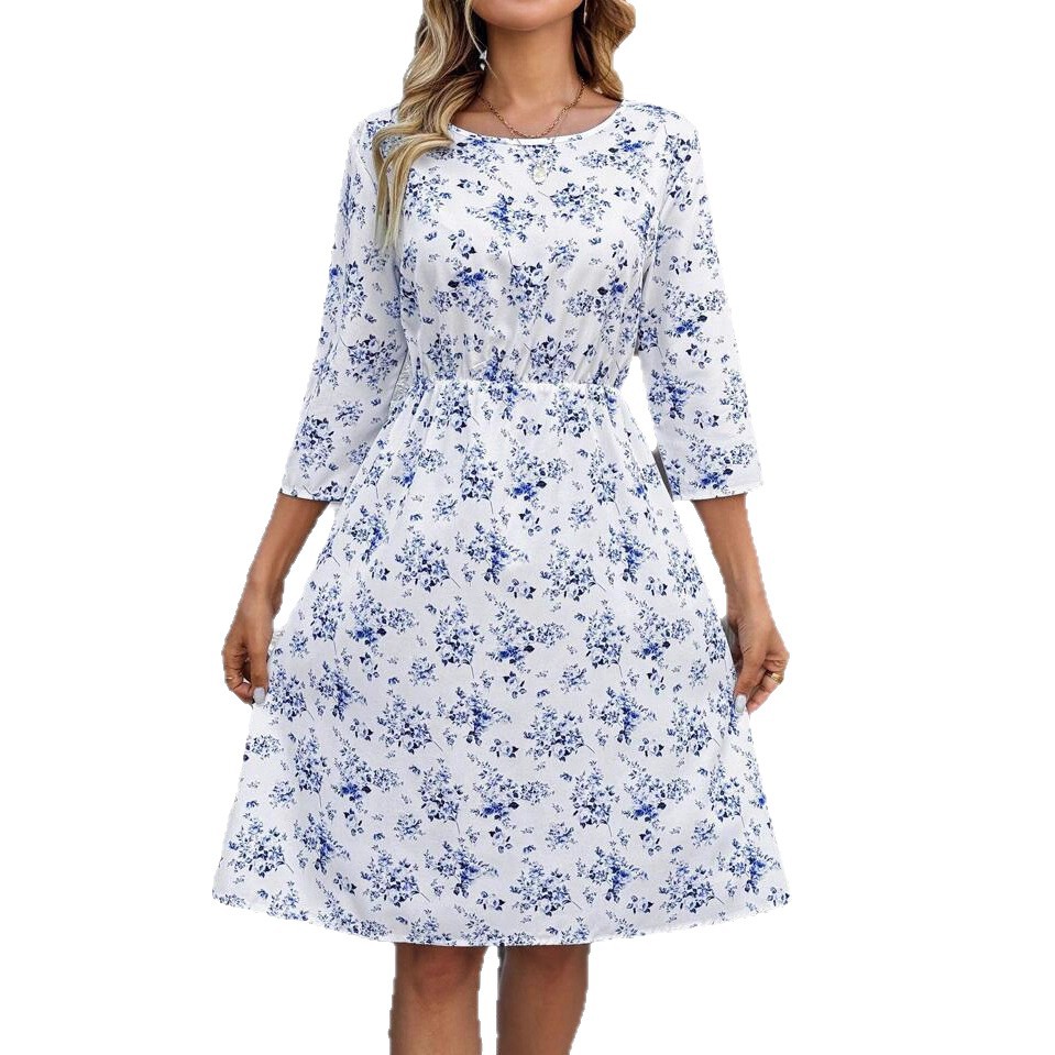 欧美外贸新款亚马逊跨境女装度假休闲时尚花卉印花松紧收腰连衣裙