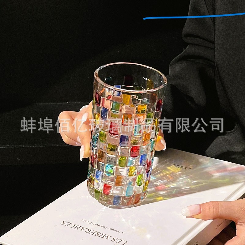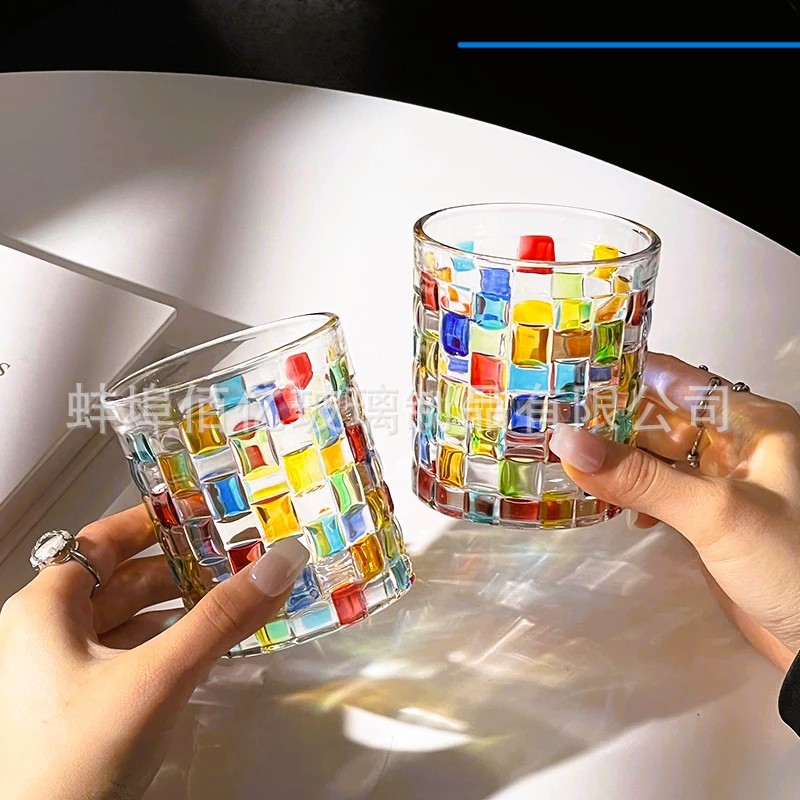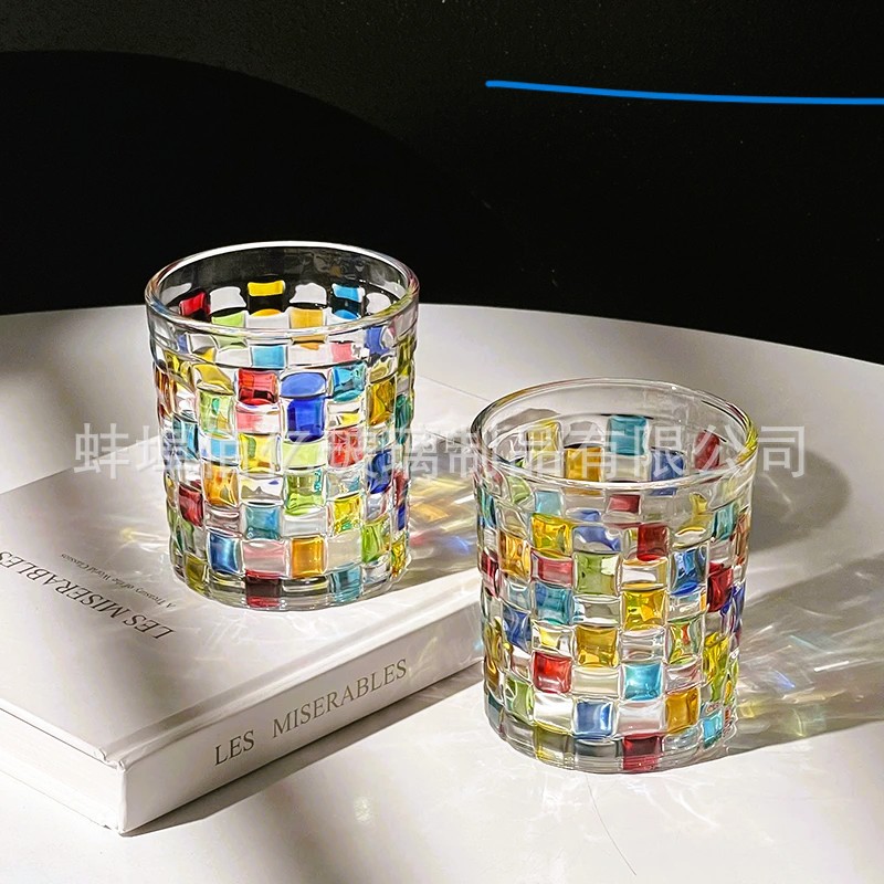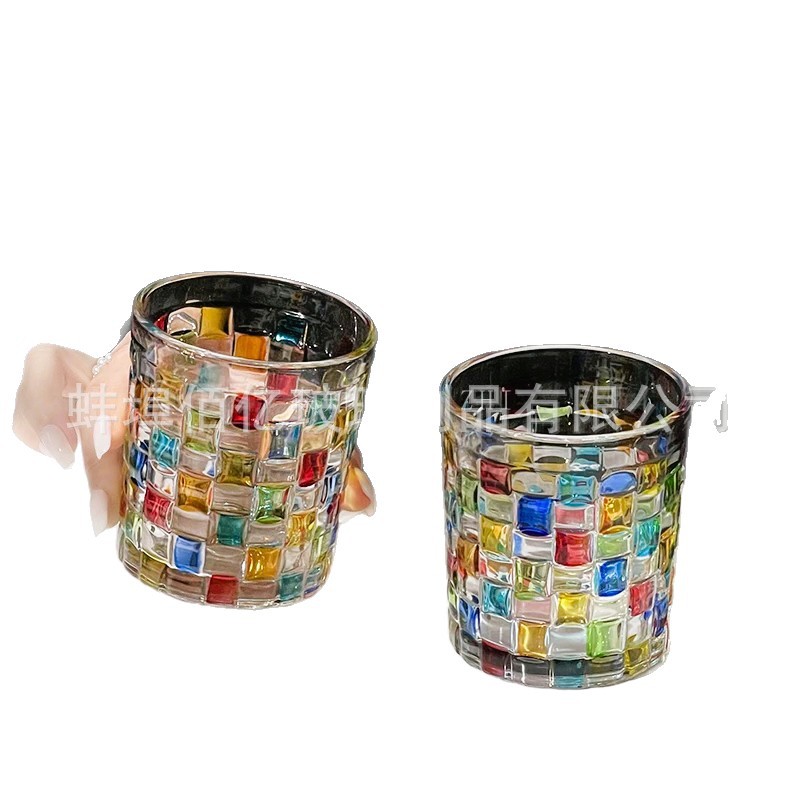 会折射彩虹光藤编杯中古方块格子玻璃杯手绘设计感小众威士忌酒杯