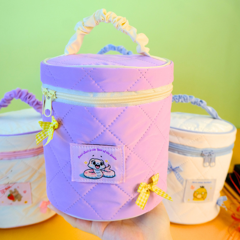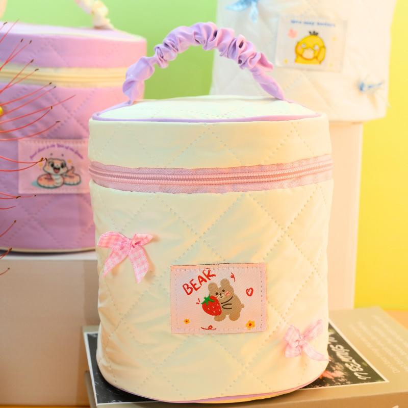 圆形手提萌趣蝴蝶结新款化妆包满月伴手礼盒便携绗缝化妆品收纳包