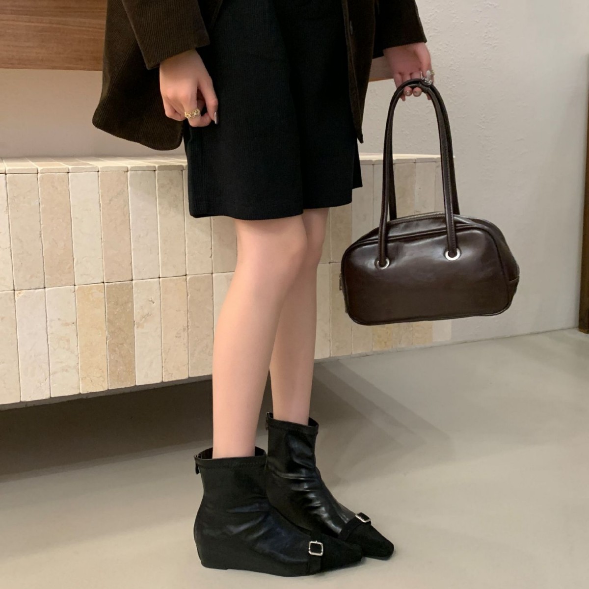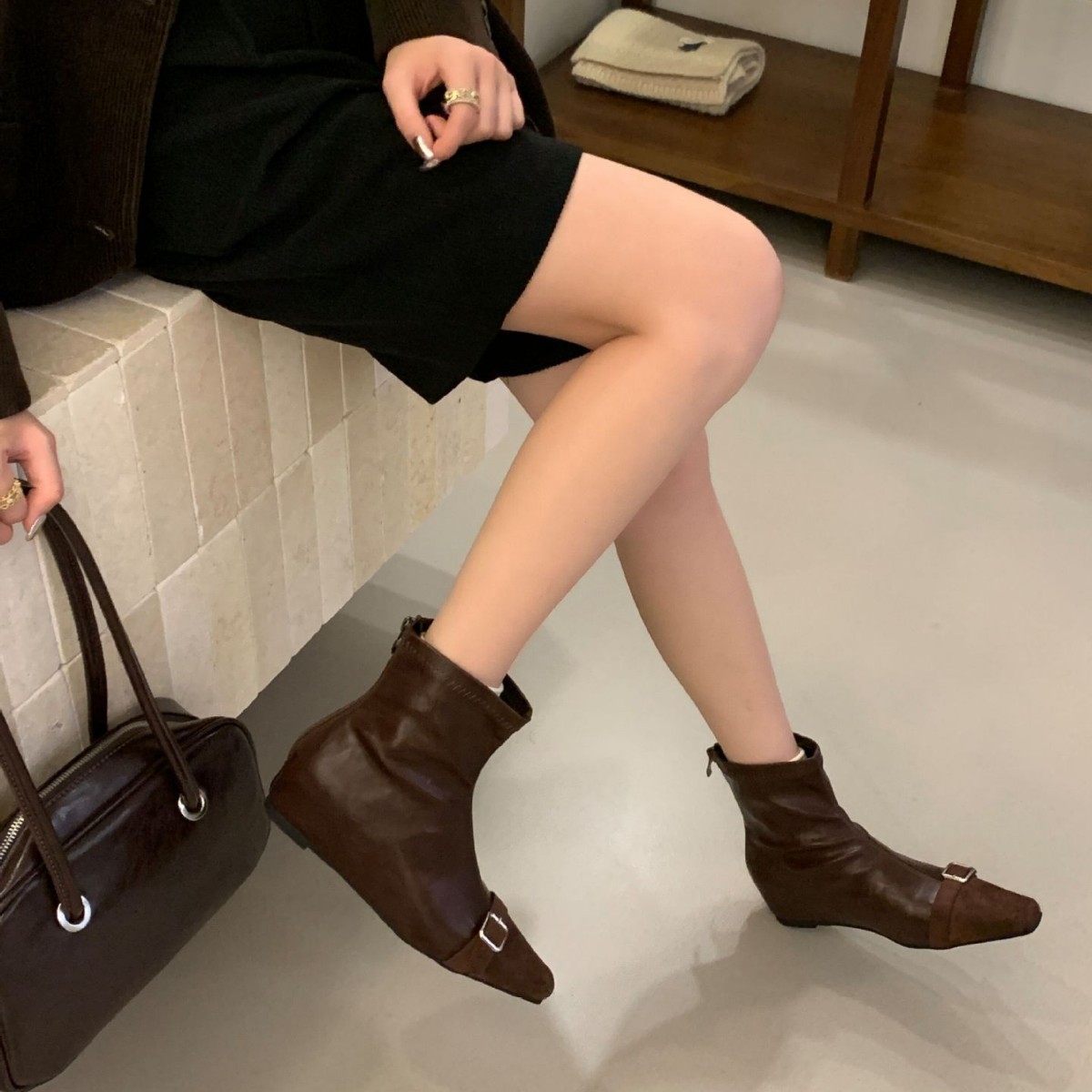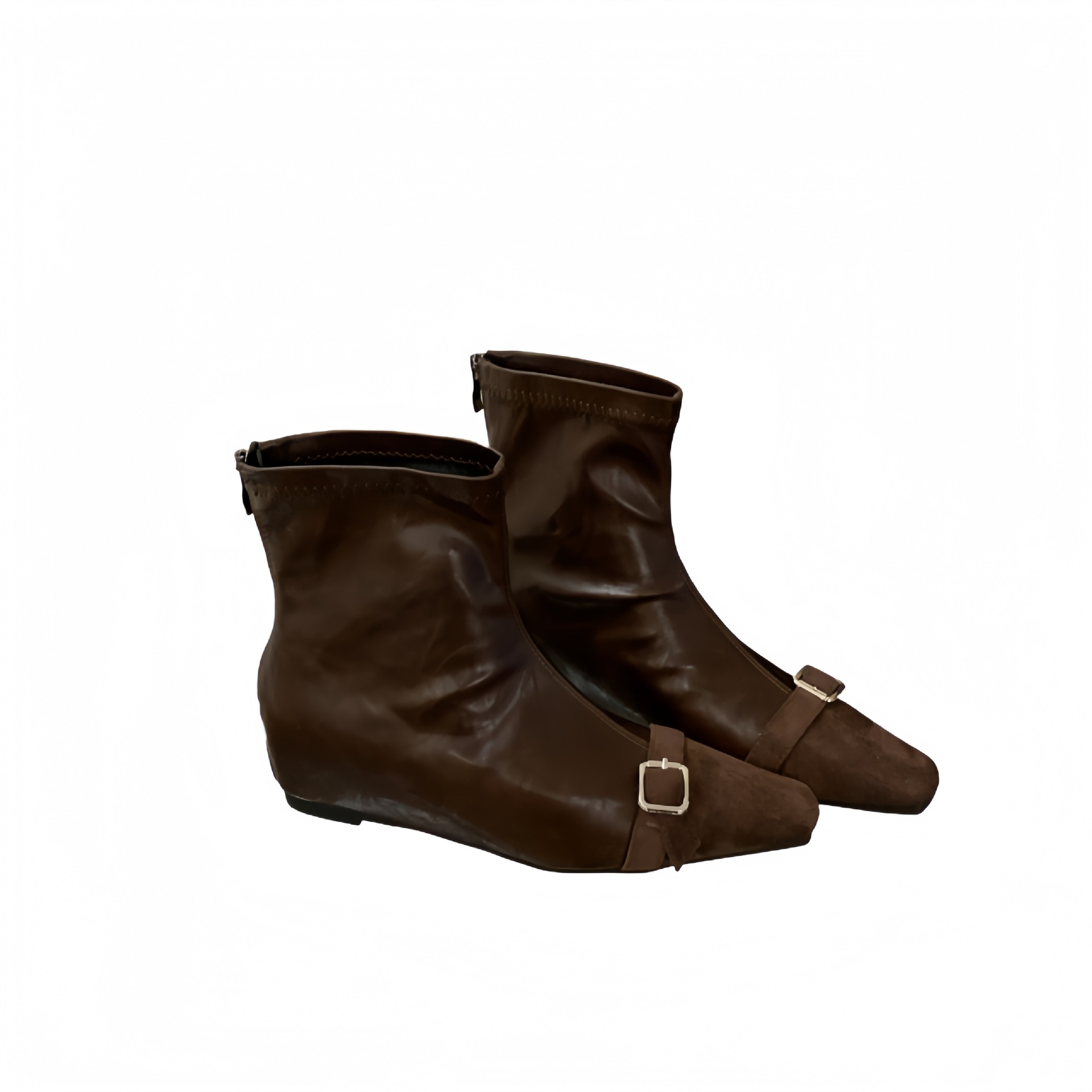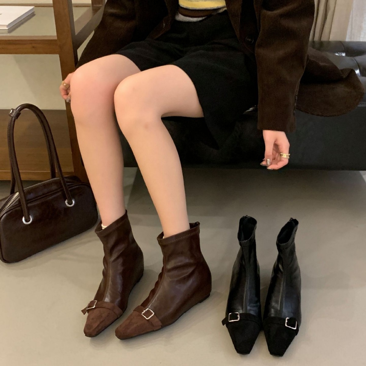 ins 巨好穿~ 复古绒面拼接小方头马丁靴弹力瘦瘦靴坡跟法式女单靴