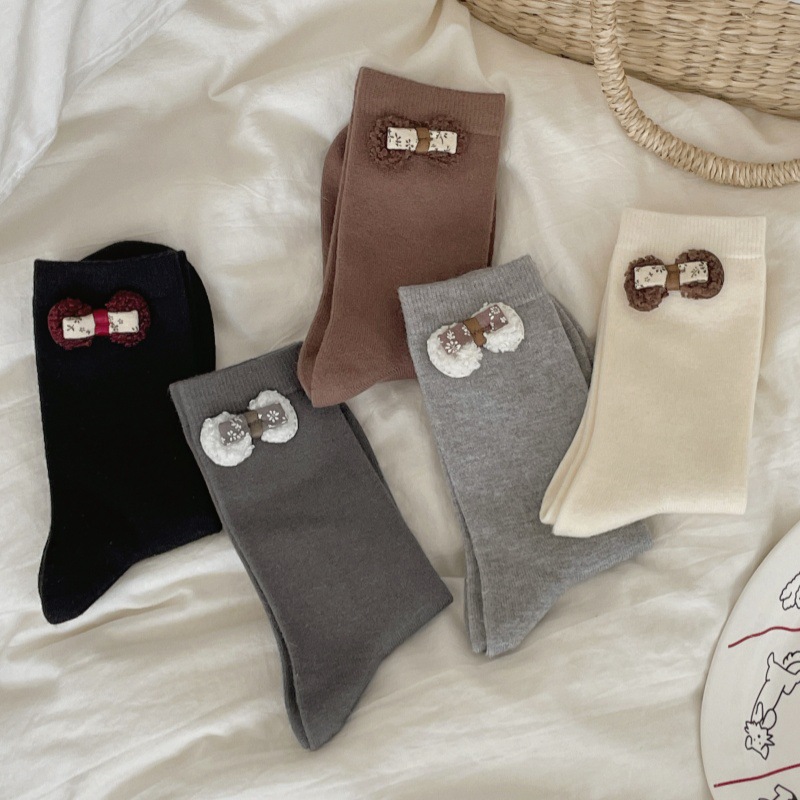 秋冬新品兔绒女袜日系蝴蝶结中筒袜个性时尚保暖袜软糯无骨堆堆袜