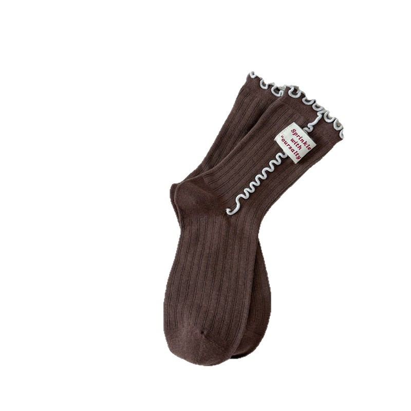 韩系玫瑰花咖色系袜子女布标日系jk纽扣撞色中筒袜拼接堆堆袜子
