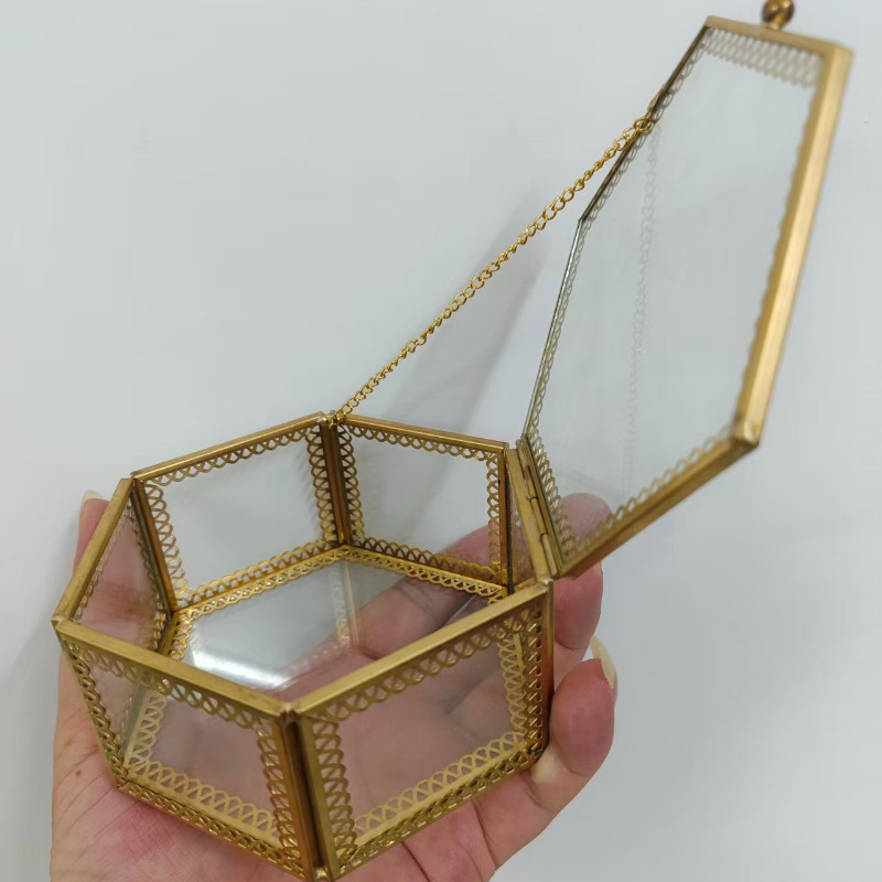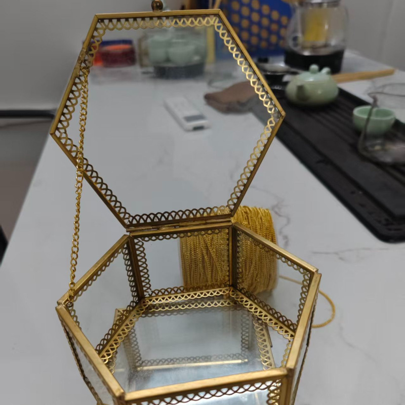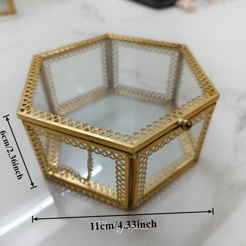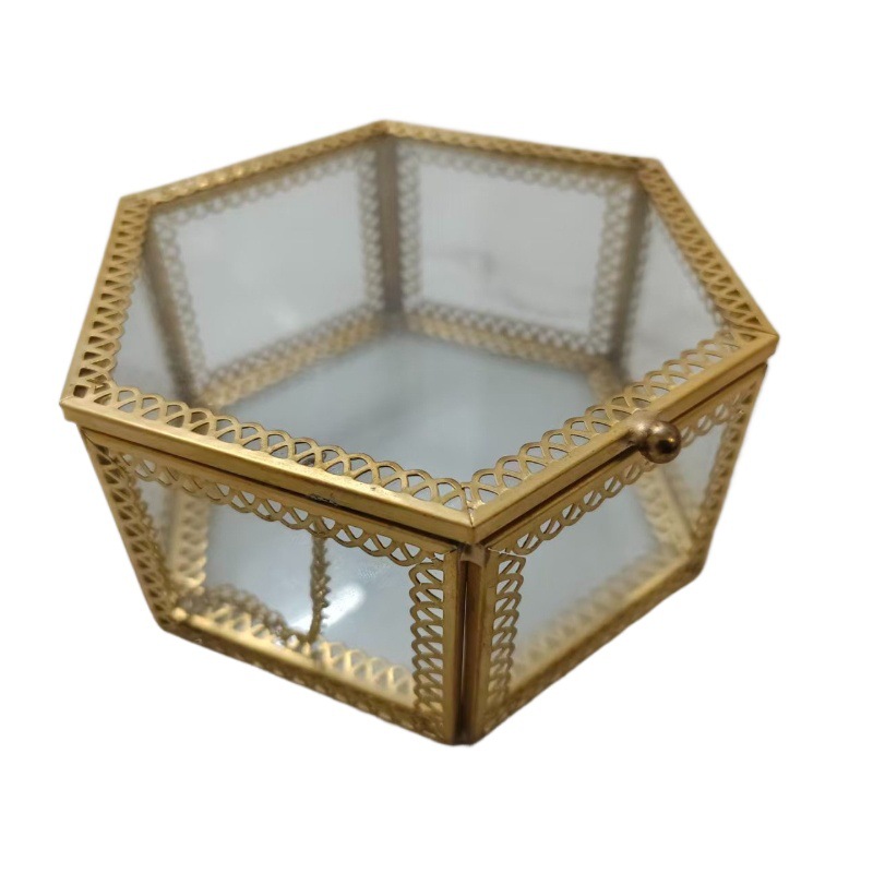 六边金色+透明玻璃迷你珠宝首饰盒桌面首饰收纳盒做精致女生轻奢