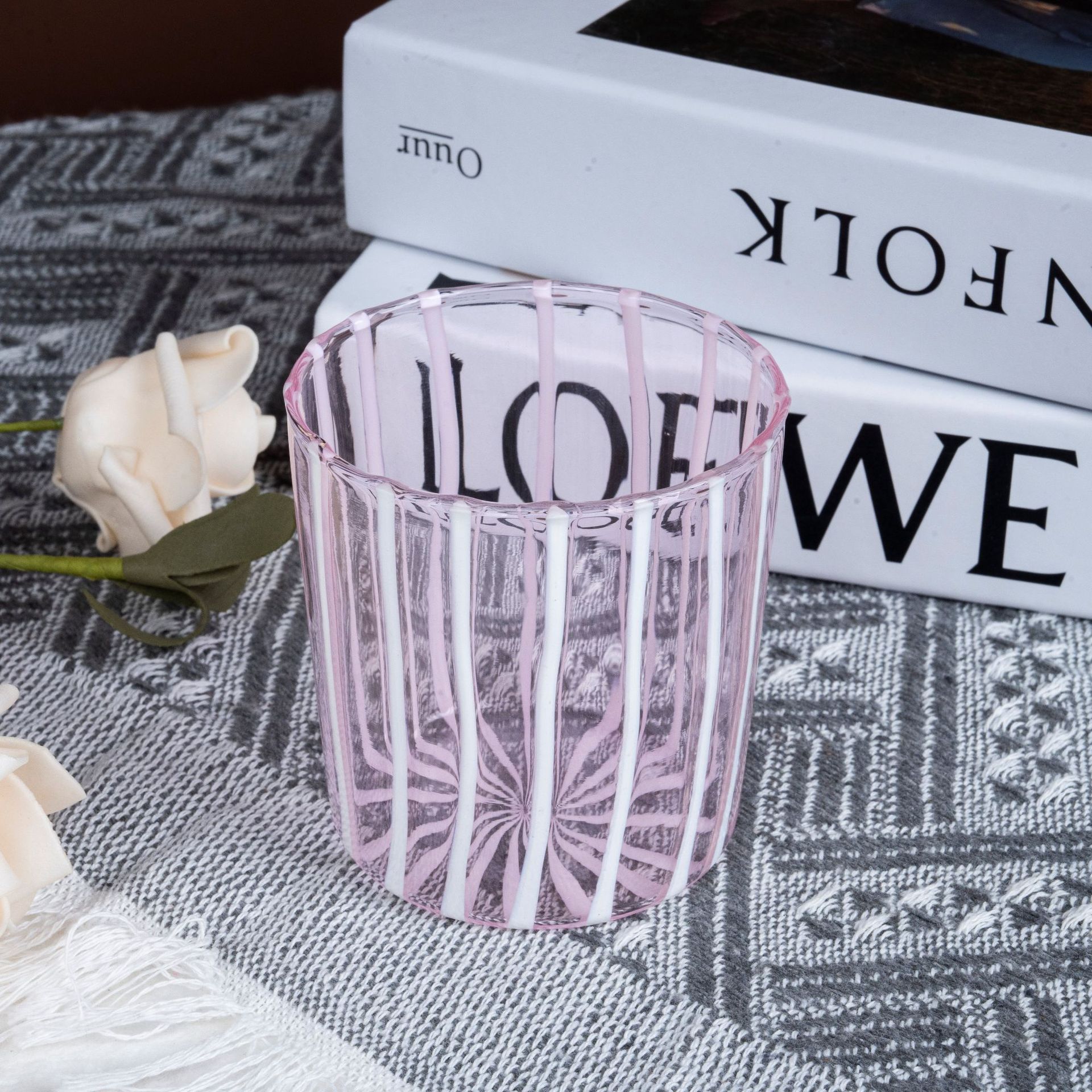手工艺术粉白条纹玻璃杯 少女心ins风喝水杯 家用耐热果汁杯咖啡