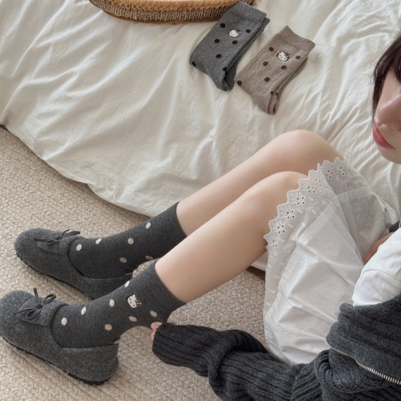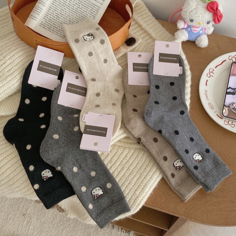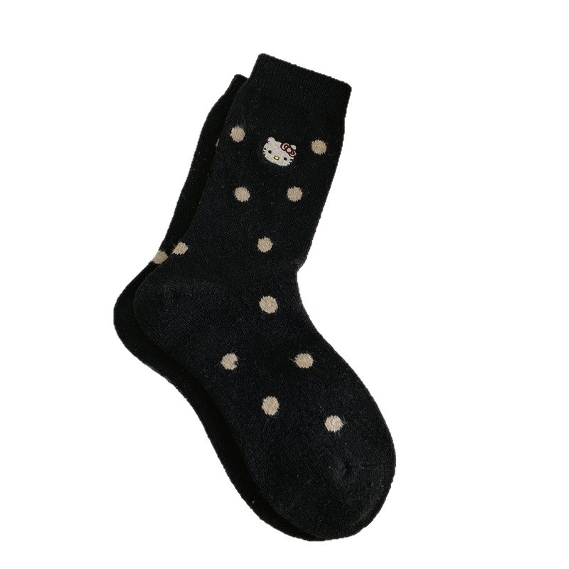秋冬羊毛袜子女加厚保暖韩版可爱Kitty刺绣中筒袜ins潮无骨堆堆袜