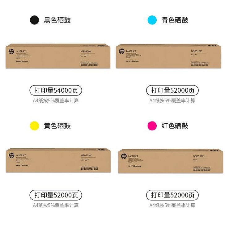 | 颜色 | W9053MC红色墨粉盒约52000页 | 颜色 | W9050-3MC一套4色 |